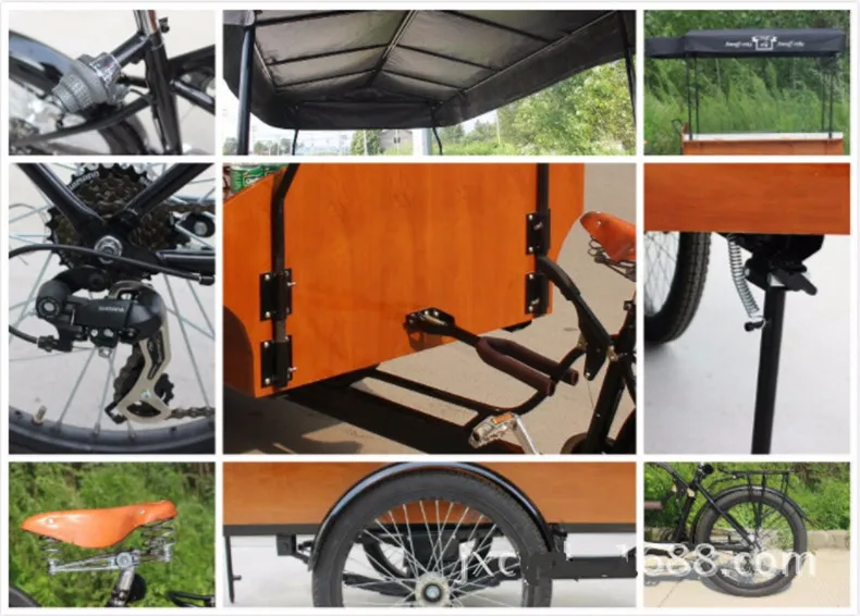 Item:Cargo Bike,Food Cart,Adult Tricycle,Electric Tricycle. Motor: 500w rear wheel motor Front Brake: Disc brake Transmission: 6gear speeds (SHIMANO) Rear Brake: Hand brake Battery: 36V/10ah Lithium Battery G.W./N.W. : 216kgs/147kgs Max Speed: 10-15km/h Box L*W*H: 1900mm*900mm*300mm Front wheel: 2.25-19 Rear wheel: 2.25-19 Trike L*W*H 3150mm * 900mm * 2100mm Packing L*W*H: 2300mm * 1170mm * 700mm Material: Steel frame and wooden box
