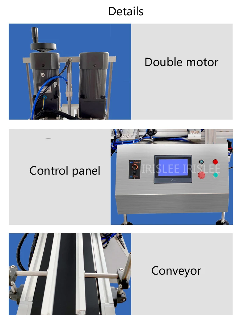 Напряжение: 220 В/50 Гц Диаметр крышки: 25-60 мм Высота бутылки: 40-290 мм Скорость: 25-30 бутылок/мин Размер машины: 1500*600*1200 мм Вес машины: около 130 кг Длина конвейера: 1500 мм Примечание: пневматическое управление, воздушный компрессор должен быть подготавливан покупателем.