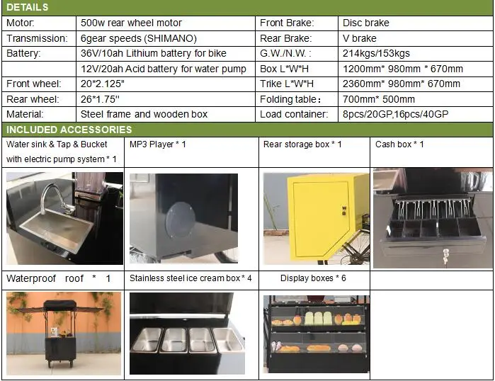 Товар: грузовой велосипед, тележка для еды, трехколесный велосипед для взрослых, Электрический трехколесный велосипед. Мотор: 500 Вт Мотор заднего колеса Передний тормоз: дисковый тормоз Передача: 6 скоростей передачи (SHIMANO) Задний тормоз: V тормоз Батарея: 36V/10ah литий Батарея для велосипеда 12V/20ah кислотная батарея для водяного насоса G.W./N.W. : 214кг/153кг Коробка Д * Ш * В: 1200 мм * 980 мм * 670 мм Переднее колесо: 20*2,125'' Трайк Д * Ш * В: 2360 мм * 980 мм * 670 мм Заднее колесо: 26*1,75'' Складной стол: 700 мм * 500 мм Материал: стальной каркас и деревянная коробка