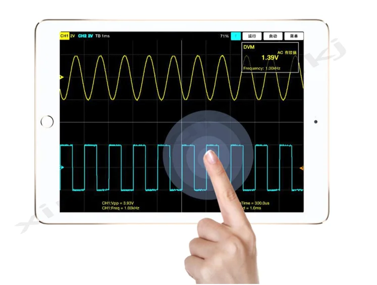 Phone / iPad Windows oscilloscope, multi-touch operation Wireless WIFI communication (also USB communication), WIFI Direct directly / through router Built-in lithium battery, endurance time up to 4 hours, no external power supply, floating measurement, safe and convenient 70MHz bandwidth, real-time sampling rate up to 250MSa / s Can be connected with iPad and iPhone at the same time, when iPad is operated, it can be observed on iPhone Excellent industrial design, the shell adopts the same anodized aluminum as iPad, not only beautiful and elegant And greatly improve the surface hardness of aluminum alloy, has good heat resistance and wear resistance Small size, easy to carry, easy to use on business Software support: IOS, Win10, Win8, Win7, Windows NT, VISTA, etc. More than 20 kinds of automatic measurement functions, PASS / FAIL Check function, suitable for engineering applications FFT spectrum analysis Waveform average, afterglow, brightness adjustment, reverse, add, subtract, multiply, divide, X-Y display Waveform data can be output to EXCEL, BMP, JPG according to time and voltage