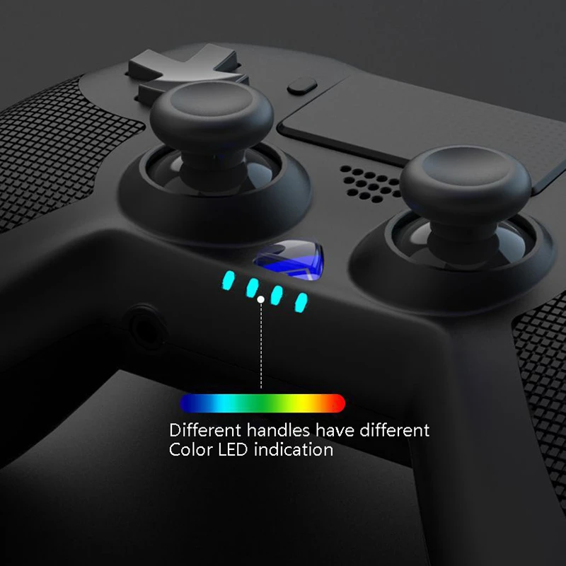 3.Built-in LED color breathing light, the handle has a colored LED light bar to indicate the player's handle channel function and status indication. The indication function is the same as the P 4 handle. Different handles are indicated by different colors of LEDs.