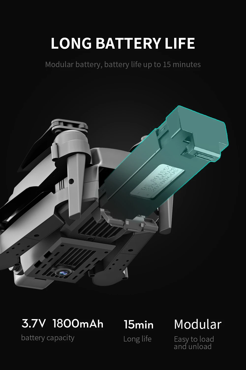- 15Максимальное время полета минут. Интеллектуальный аккумулятор высокой емкости 3,7 в 1800 мАч обеспечивает до 15 минут полета.
