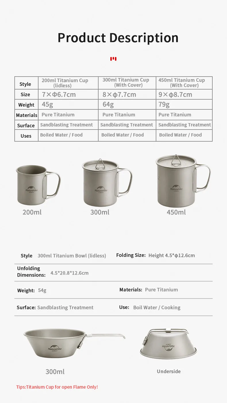 Стиль: титановая чашка 200 мл (без крышки)/титановая чашка 300 мл (с крышкой)/