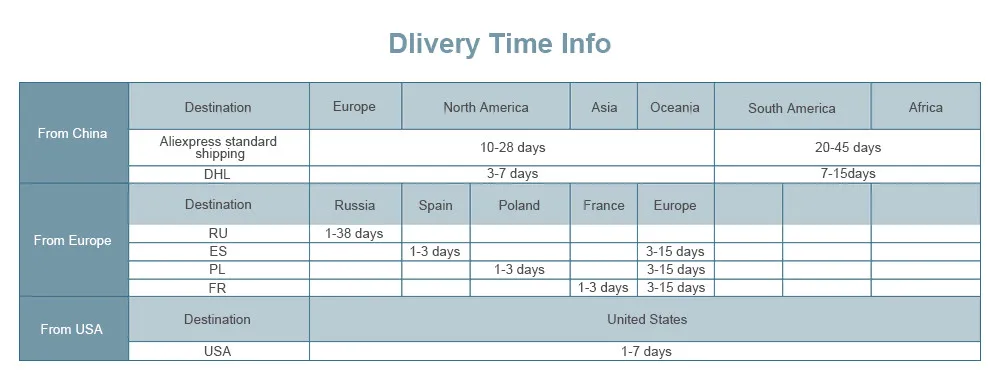 2. У нас есть местный склад в России, США, Испании, Польше, Франции и Индонезии. Если вы хотите быструю доставку, пожалуйста, выберите «отправка из России, США, Испании и Франции» или «доставка», вы получите удовольствие от местного обслуживания, поддержка возврата на местный склад в течение 15 дней без объяснения причин, без НДС для покупателей.