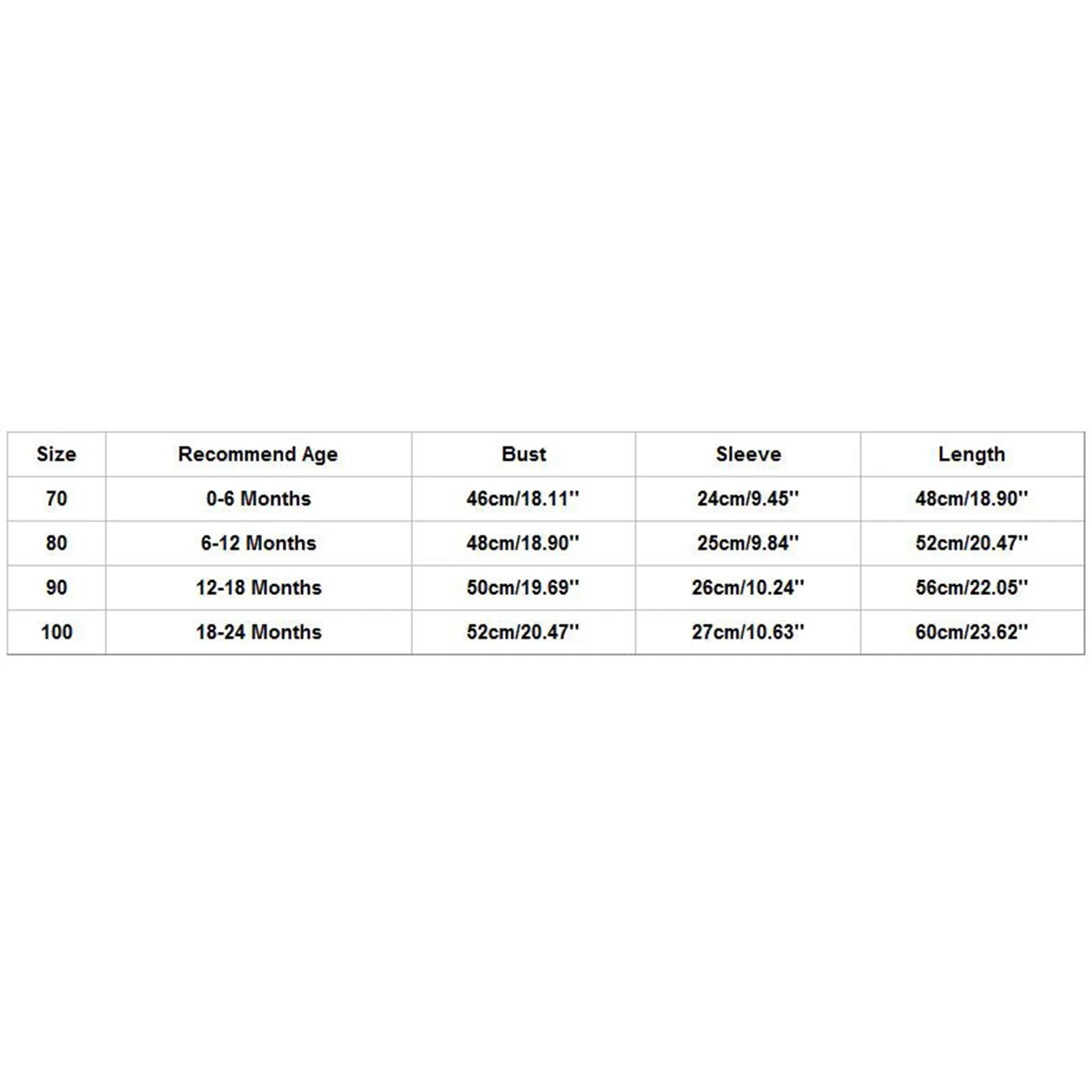 Размер Рекомендуемый возраст Бюст Рукав Длина 70 0-6 месяцев 46 см/18,11'' 24 см/9,45'' 48 см/18,90'' 80 6-12 месяцев 48 см/18,90'' 25 см/9,84'' 52 см/20,47'' 90 12-18 месяцев 50 см/19,69'' 26 см/10,24'' 56 см/22,05'' 100 18-24 месяцев 52 см/20,47'' 27 см/10,63'' 60 см/23,62''