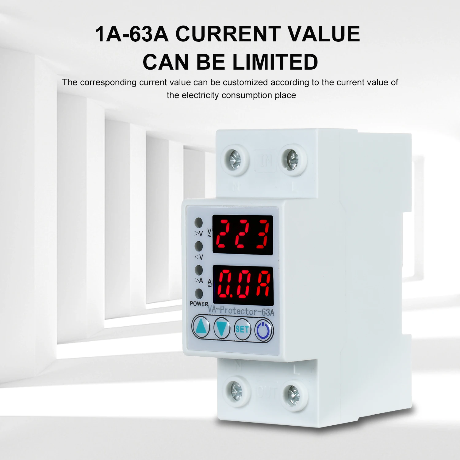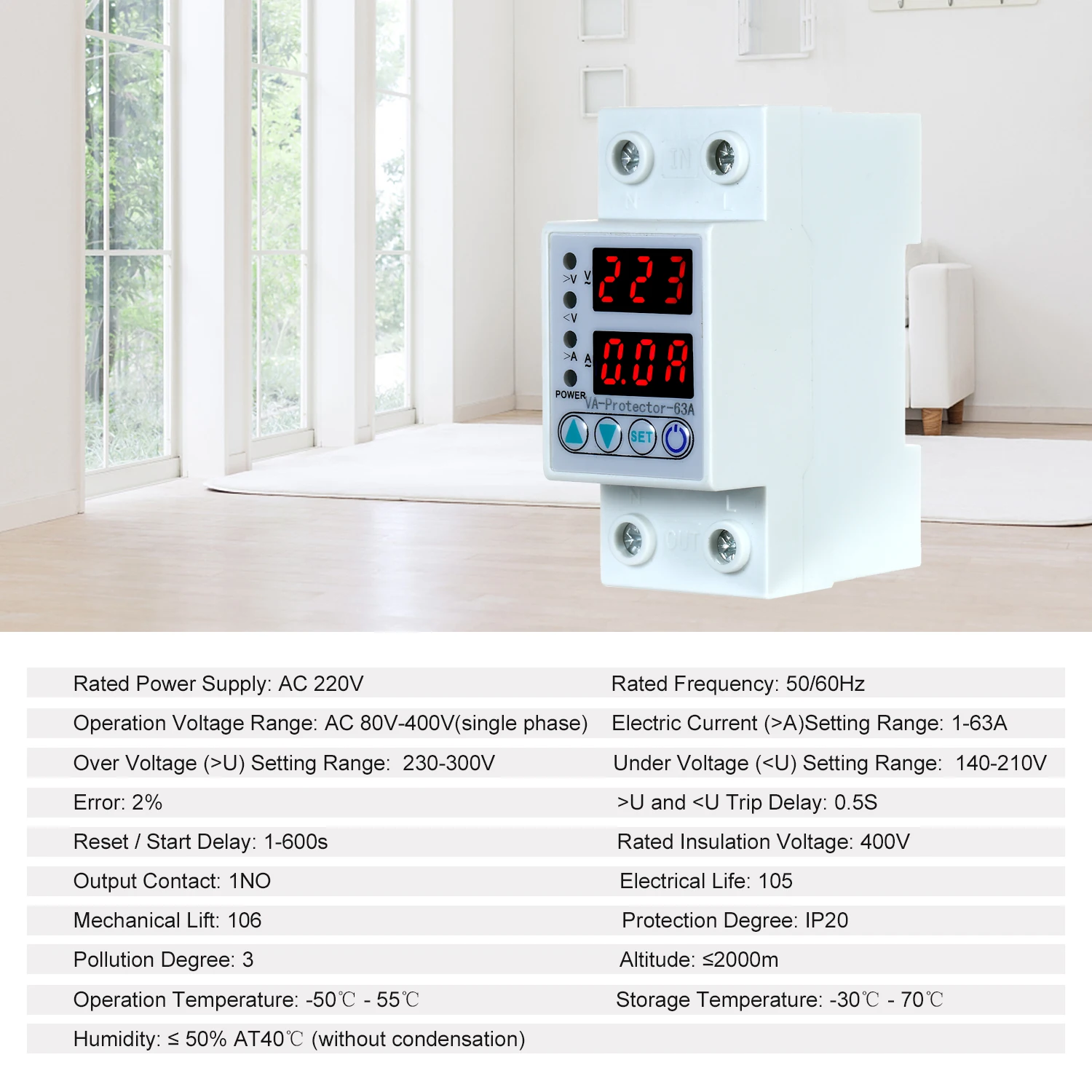 Двойной светодиодный дисплей Регулируемый Напряжение Ток протектор подходит для однофазного переменного тока 220 В пер. тока, 50/60 Гц, номинальный рабочий ток 63A. Он в основном используется для входа в бытовую коробку или перенапряжения, низкого напряжения или защиты от перегрузки по току распределительных линий для однофазного электрического оборудования. Его основная особенность заключается в том, что когда цепь имеет перенапряжение или Низковольтное напряжение, проблемы с током, продукт может немедленно отключить источник питания для защиты электрооборудования от повреждения, кроме того, протектор может автоматически включать источник питания, когда напряжение цепи возвращается к нормальному. Значения перенапряжения, низкого напряжения и перегрузки по току этого продукта могут быть настроены самостоятельно и могут быть скорректированы на основе местного практического состояния.