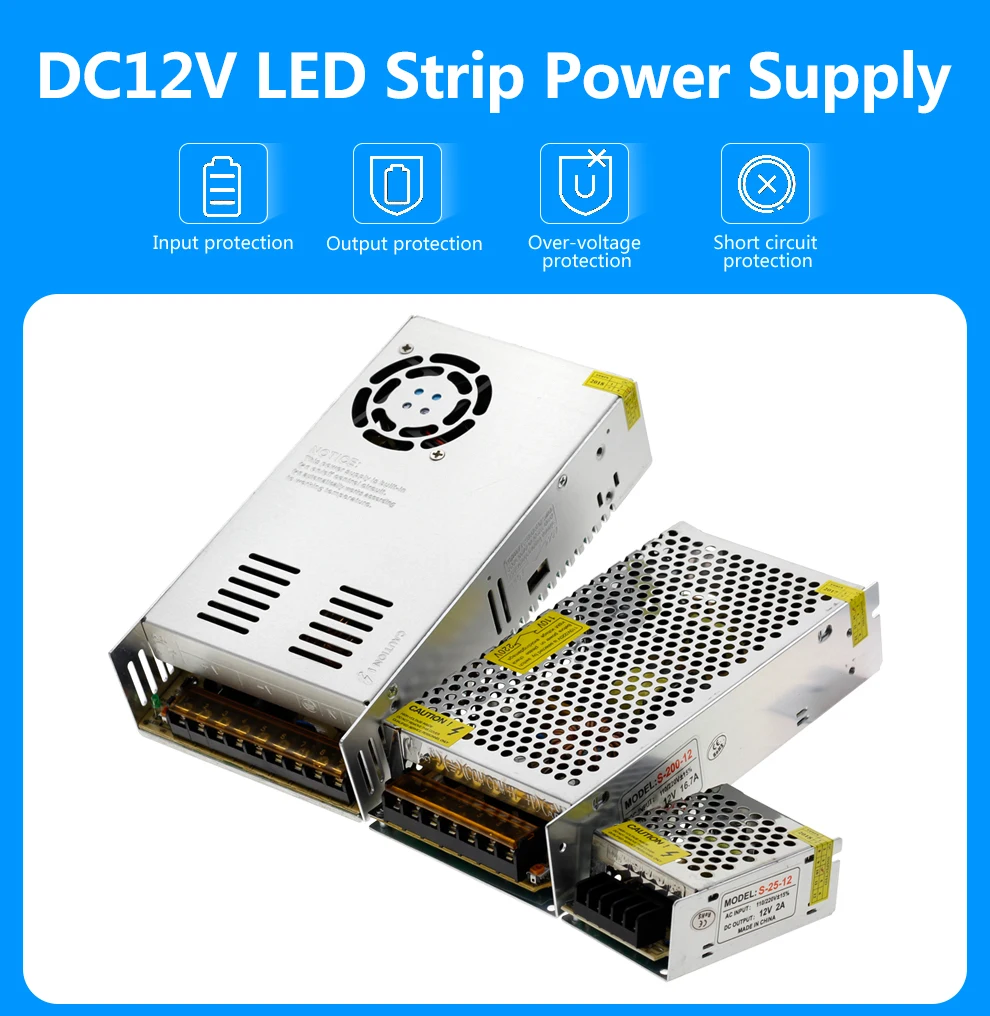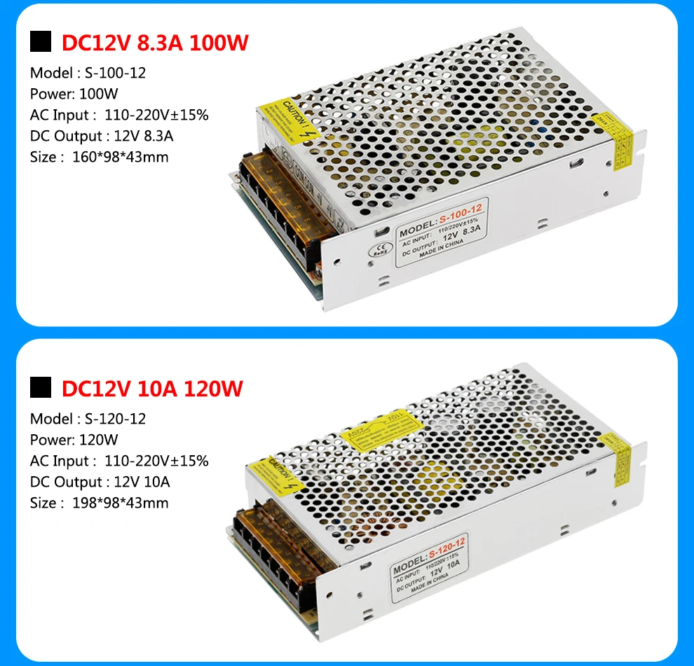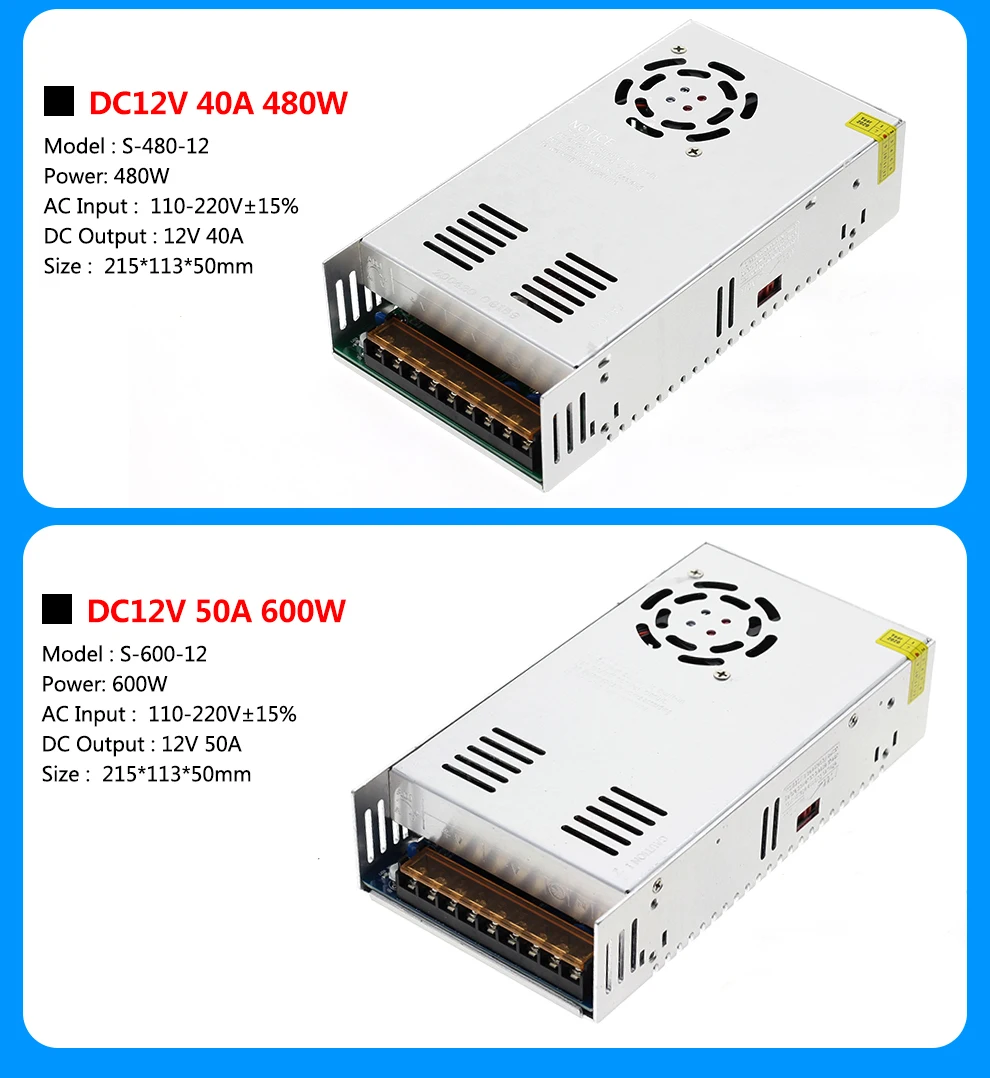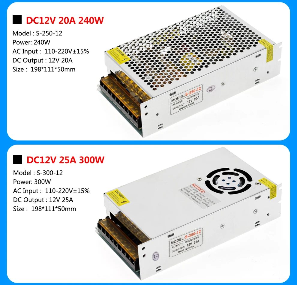 Specification: Input Voltage: AC 110V-220V±15% Output Voltage: DC12V Output Current: 1A 2A 3A 5A 8.3A 10A 12.5A 15A 20A 25A 30A 33A 40A 50A Power:12W 24W 60W 100W 120W 150W 180W 240W 300W 360W 400W 480W 600W Shell Material: Metal case / Aluminum case Working Temperature: 0~40C Storage Temperature: -20~60C Ambient Humidity: 0~95% Non-Condensation Safety Compliance: FCC / CE /Rohs High price-effective, reliability with industry standards Built-in over voltage, over current, and short circuit protection Product Pictures: