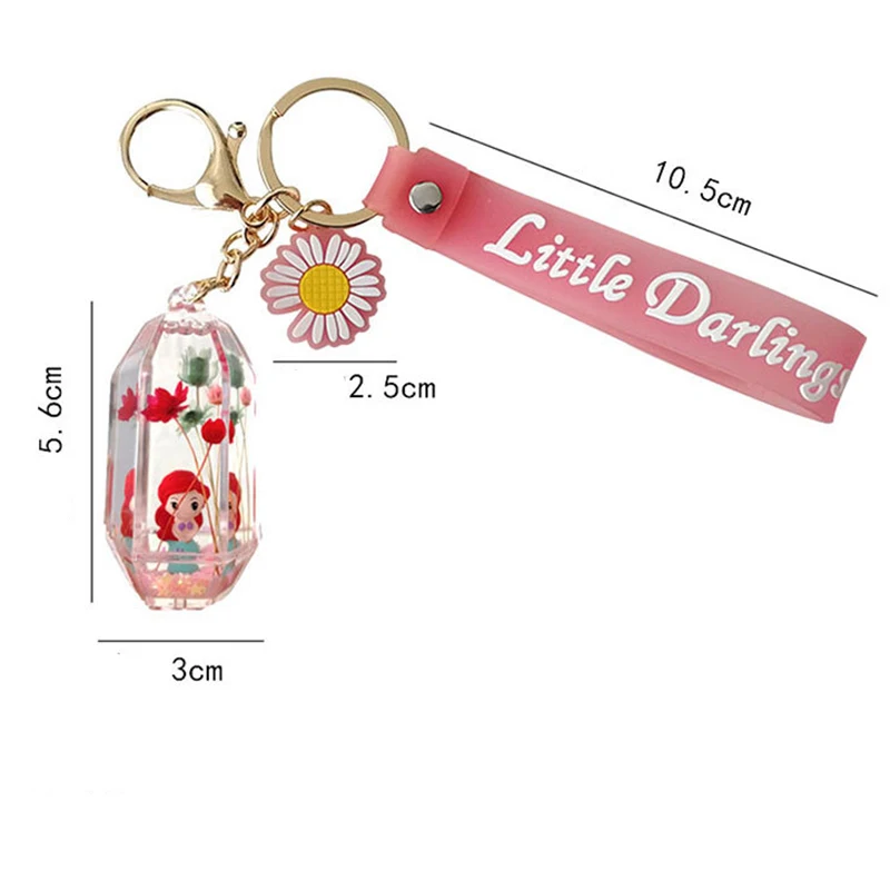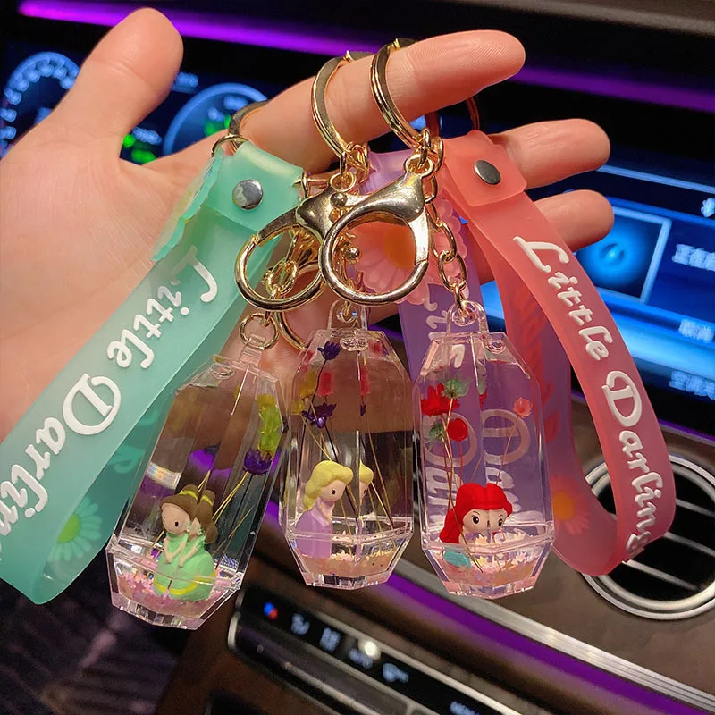Cartoon Princess Doll Keyring Transparent Liquid Floating Keychains Leather Cord Car Key Chains Pendant Cute Bag Keyfob Ornament