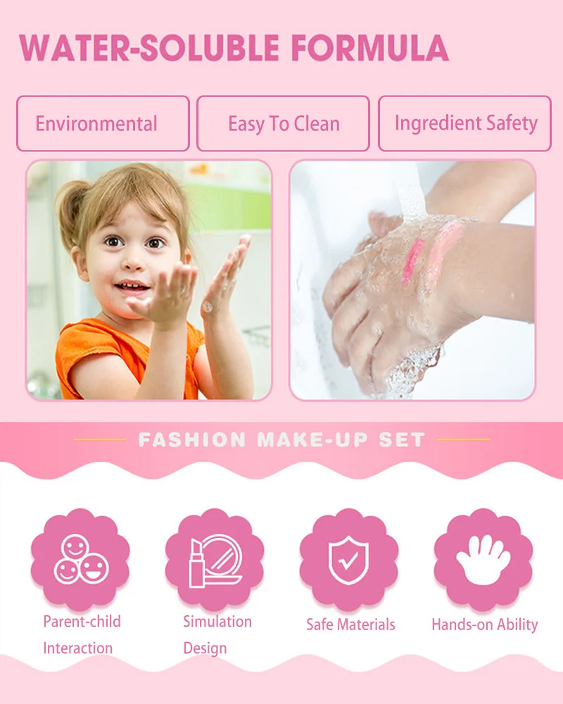 Specification: Name: Kids makeup set Size: as picture show Material: Environmentally friendly material Package: in opp bag Age range: >3 years old Feature: (1) Pretend play toys / girl makeup set (2) Safe, non-toxic and washable (3)Brand new with high quality Function: (1) Cultivating correct aesthetic view, learn to dress up themselves. (2) Enhancing self-confidence and becoming more elegant. (3)Sharing with friends, improving social skills. (4)Cultivating elegant temperament, behave more graceful. Note: (1) Due to hand measure, here may be an error of about 1 cm in the product. (2)Thus we pack it well,the box may get some damage due to the unfriendly local post office. (3) Due to the light, there maybe have a little color difference.