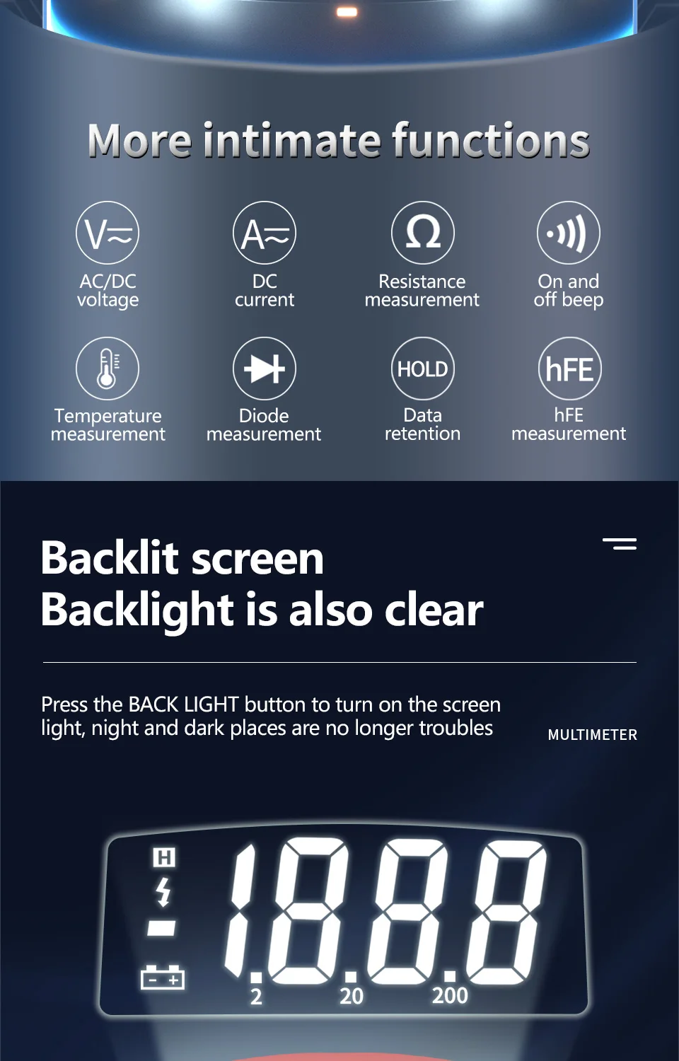 Мультиметр имеет четкий, легко читаемый ЖК-дисплей с белым подсветильник кой.
