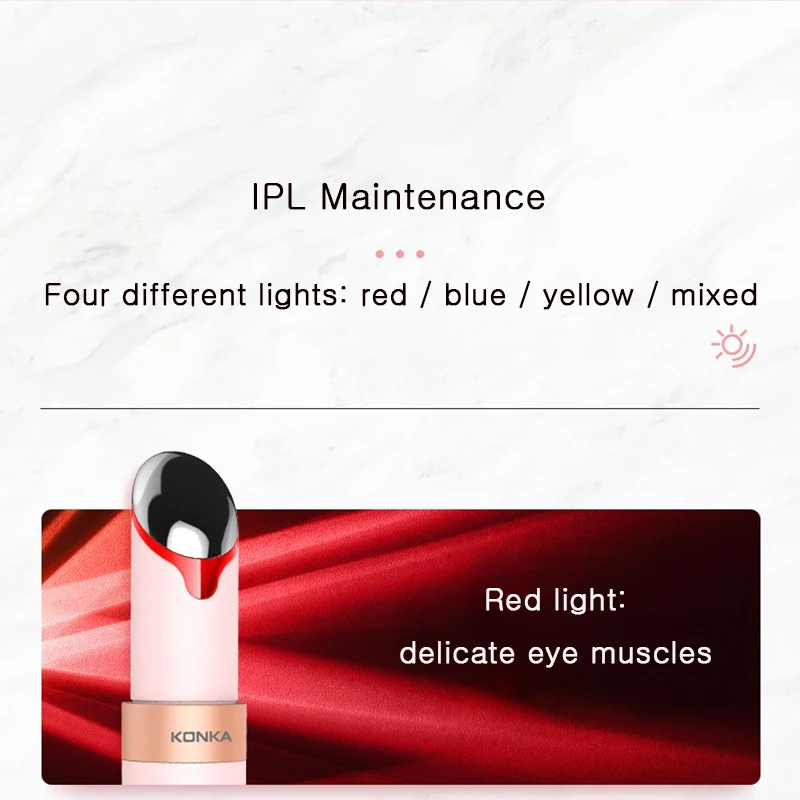 1. Четыре режима светильник Красный светильник: повышает эластичность кожи, успокаивает кожу от пожелтения и тусклости; Синий светильник: успокаивает акне, акне, акне и т. д.; Желтый светильник: разбивает меланин и отбеливает блестящую кожу; Смешанный светильник: несколько эффектов 2. Температура: 38 ° C- 45 ° C для удовлетворения потребностей различных групп людей 3-я и 3-я Регулировка вибрации 3. Регулируемые три положения вибрационного массажа 4. USB зарядка, легко носить с собой 5. Золотой Конический дизайн 45 ° 6. Горячий компресс/фотон красоты/вибрационный массаж/уход 7. Изысканная упаковка: лучший подарок для мамы, жены, дочери