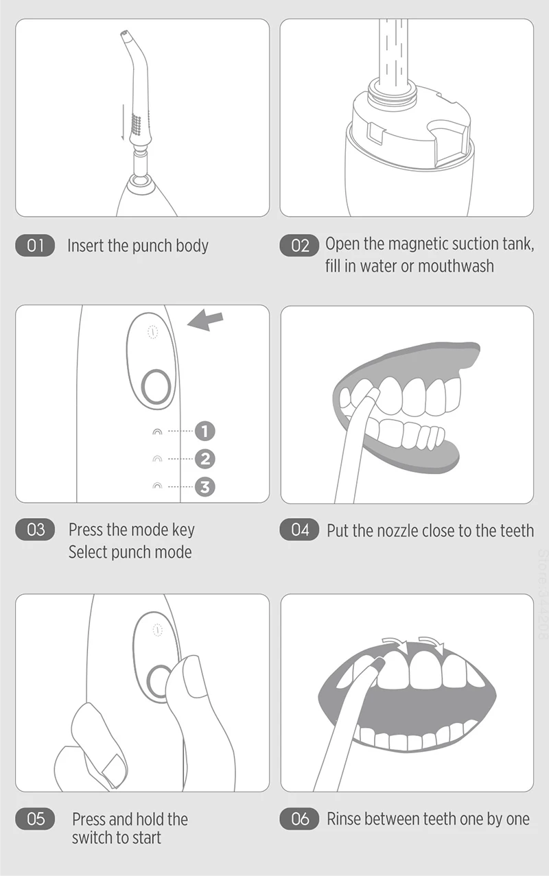 Инструкции1. Вставьте перфоратор2. Откройте Магнитный бак всасывания, заполните воду или полоскание рта3. Откройте Магнитный бак всасывания, заполните воду или полоскание рта4. Поместите насадку близко к зубам5. Нажмите и удерживайте переключатель, чтобы начать6. Промыть между зубами по одному