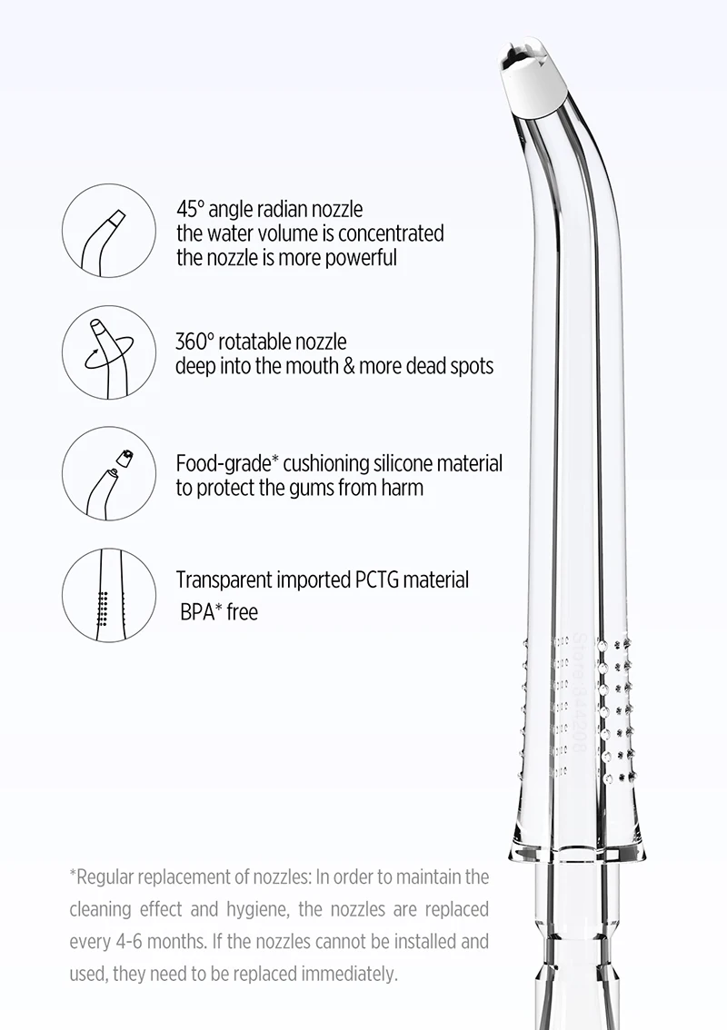 Спрей для точной очистки каждого зубного зазораРезервуар для воды может использоваться в течение 2 минут, когда он заполняется одновременно,Точный для каждого зубного зазора, гарантируя, что каждый зубной зазор промывается по крайней мере 5 раз.
