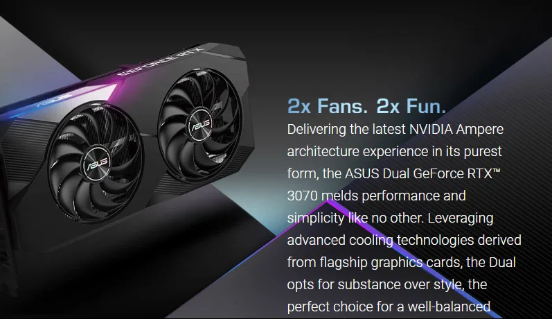 Модель DUAL-RTX3070-8G Настольная графическая карта DH NVIDIA GeForce RTX 3070 Чип-код GA104 Завод чипов NVIDIA Мастерство 8 нм Графический интерфейс стандартная поддержка PCI Express 4,0 Выходной интерфейс 1 × HDMI интерфейс, 3 × порт дисплея характеристики интерфейса Мультиэкранный дисплей 4 Объем памяти 8 Гб Тип видеопамяти GDDR 6 Видео память бит ширина 256bit Частота сердечника 1725-1755 МГц Частота видеопамяти 14000 МГц Блок процессора потока (SP) 5888 шт Блоки обработки растра (ROPs) 64 3D API DirectX 12 Ultimate Максимальное разрешение 7680 × 4320 Разъем питания 8 Pin + 8 Pin Размер доски 26,7 × 13,5 см
