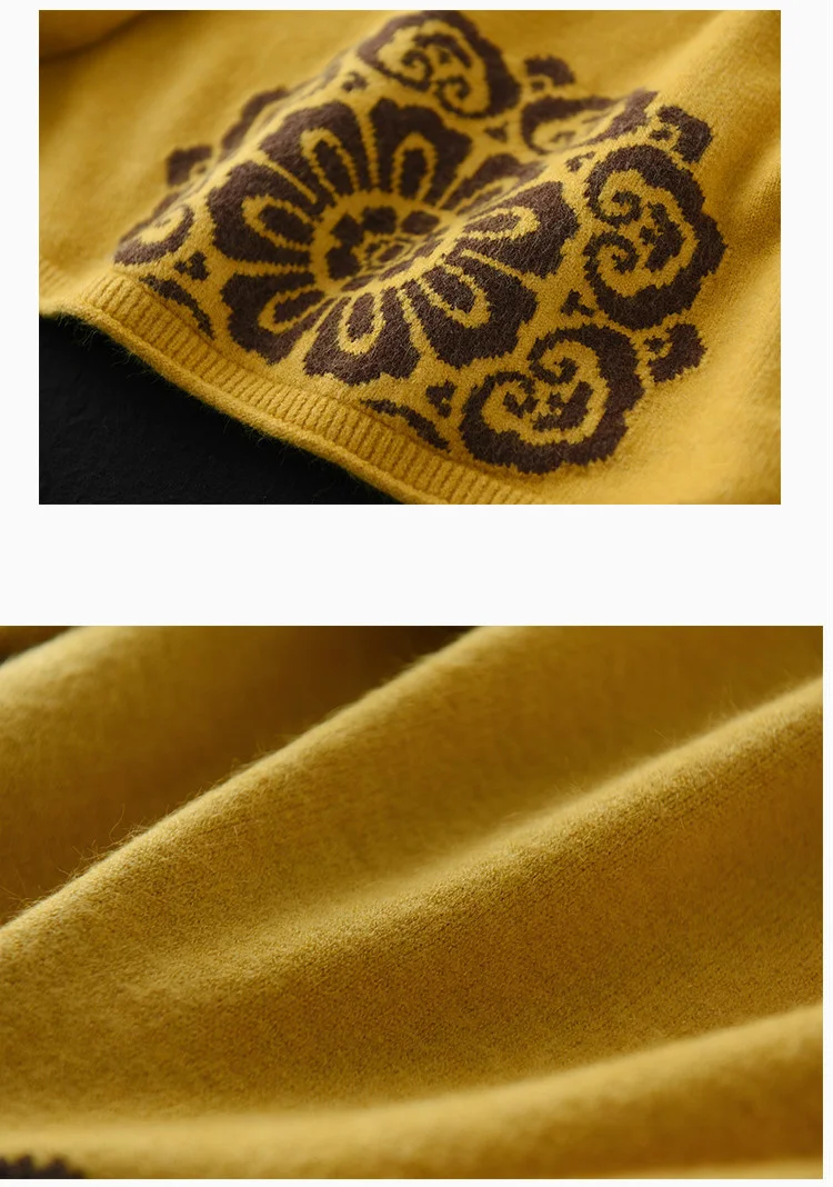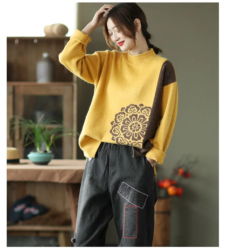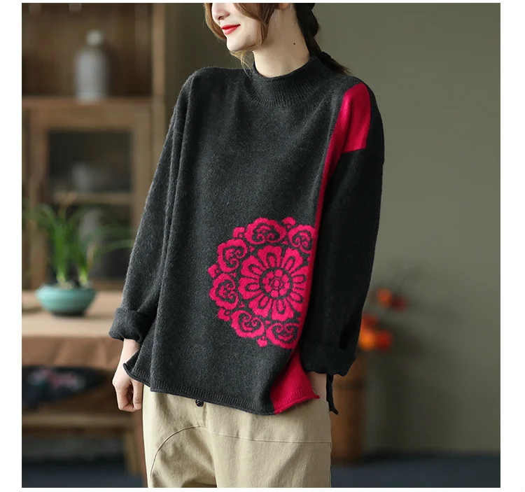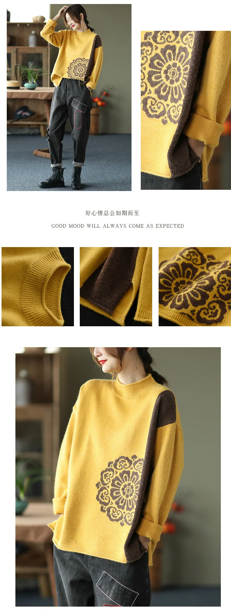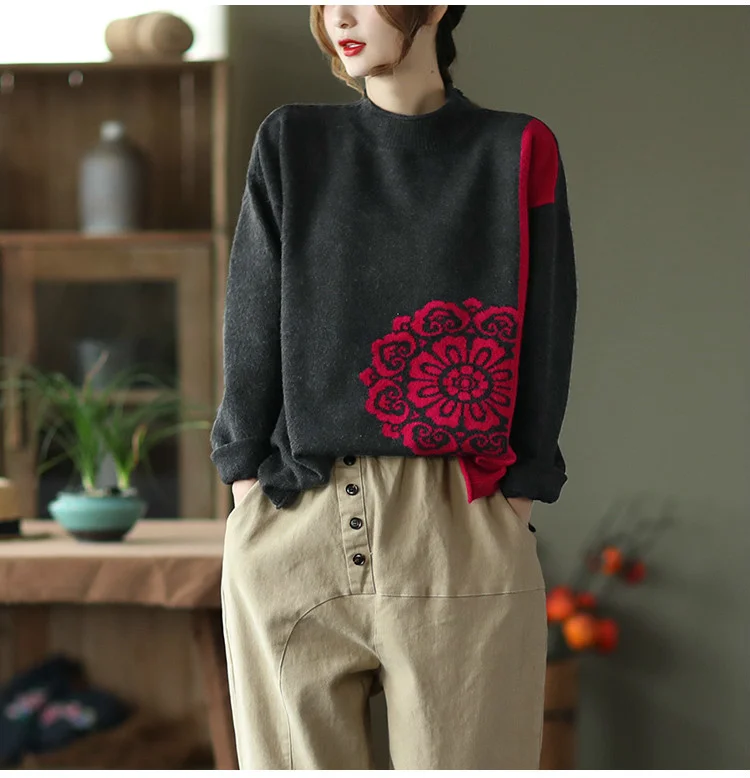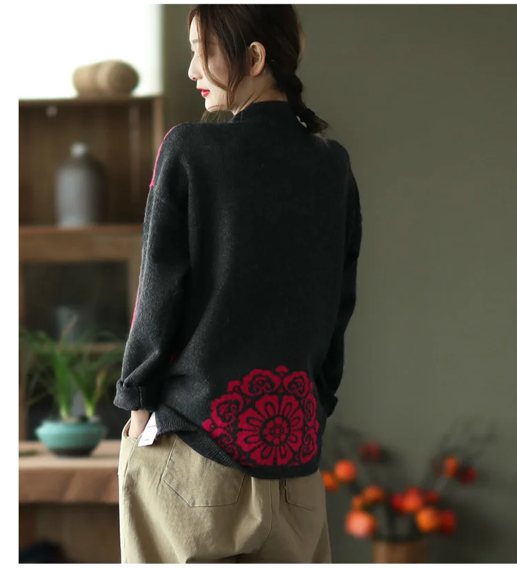 Зимние китайские повседневные винтажные теплые вязаные пуловеры с цветочным принтом