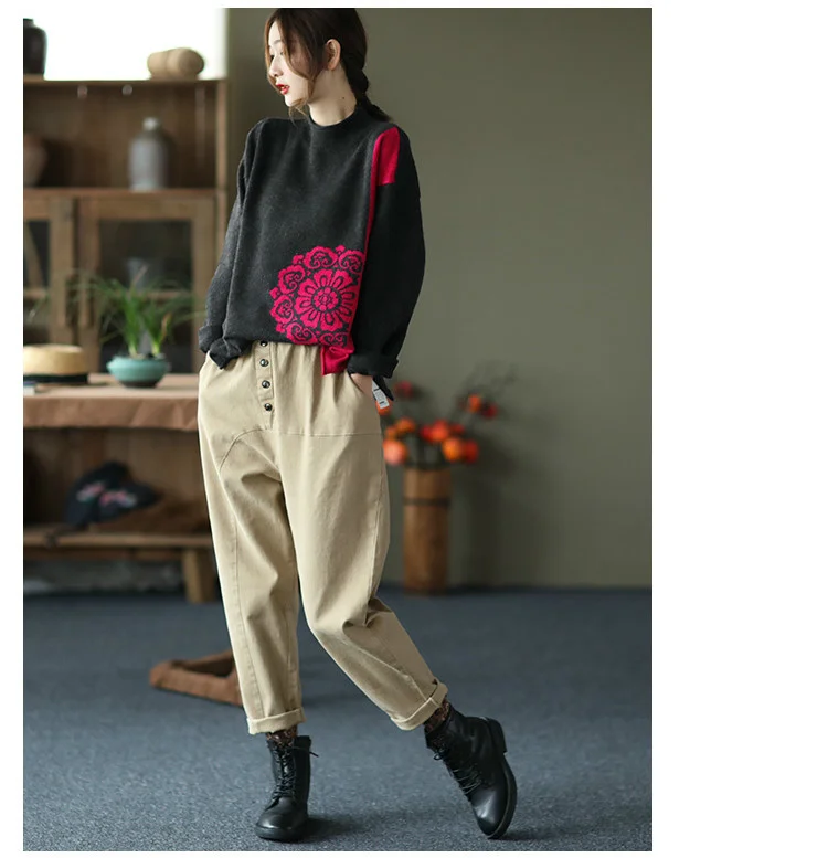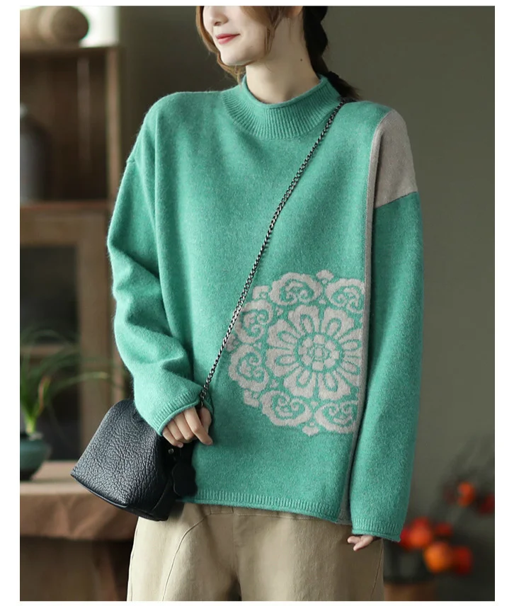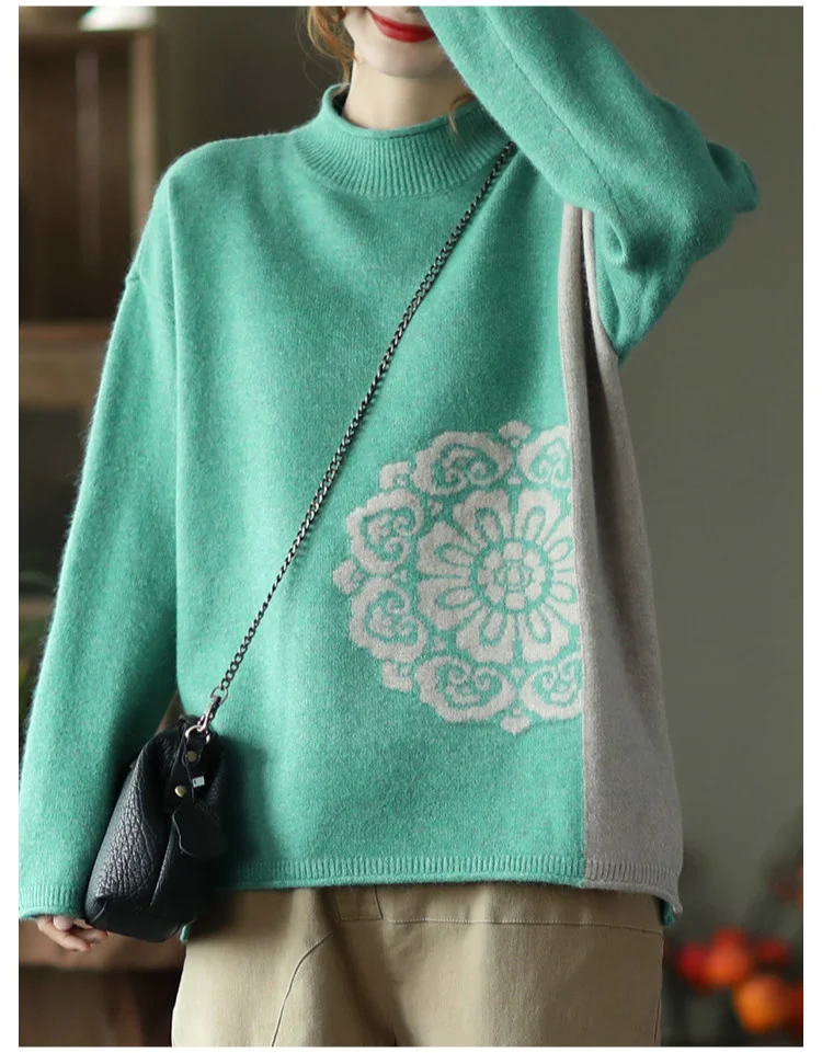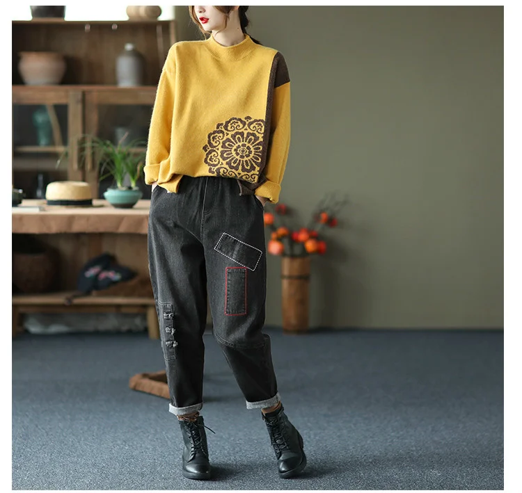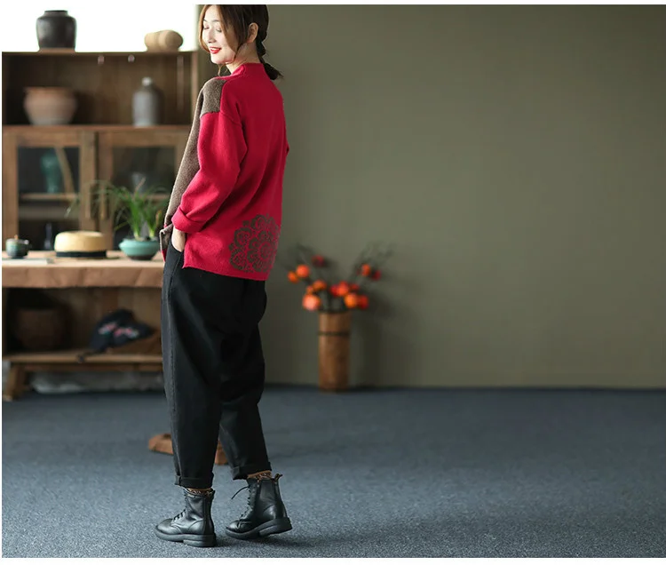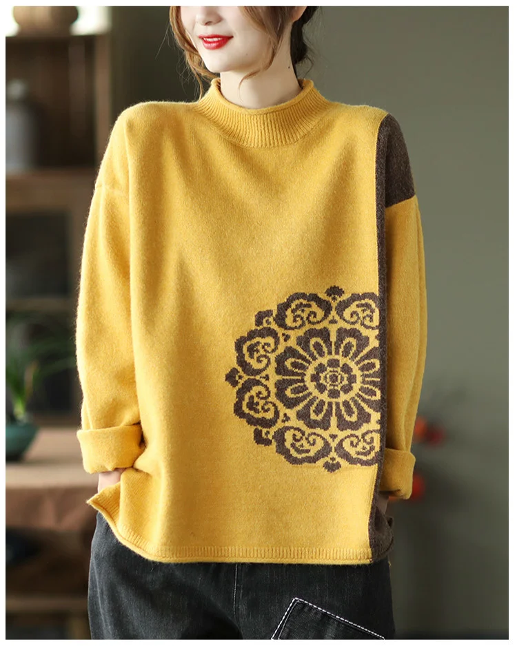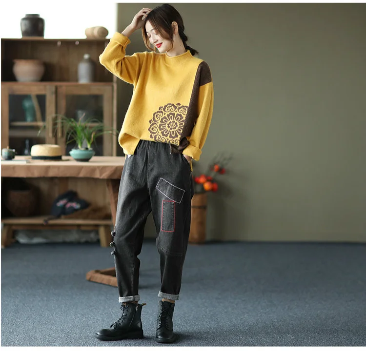 Зимние китайские повседневные винтажные теплые вязаные пуловеры с цветочным принтом