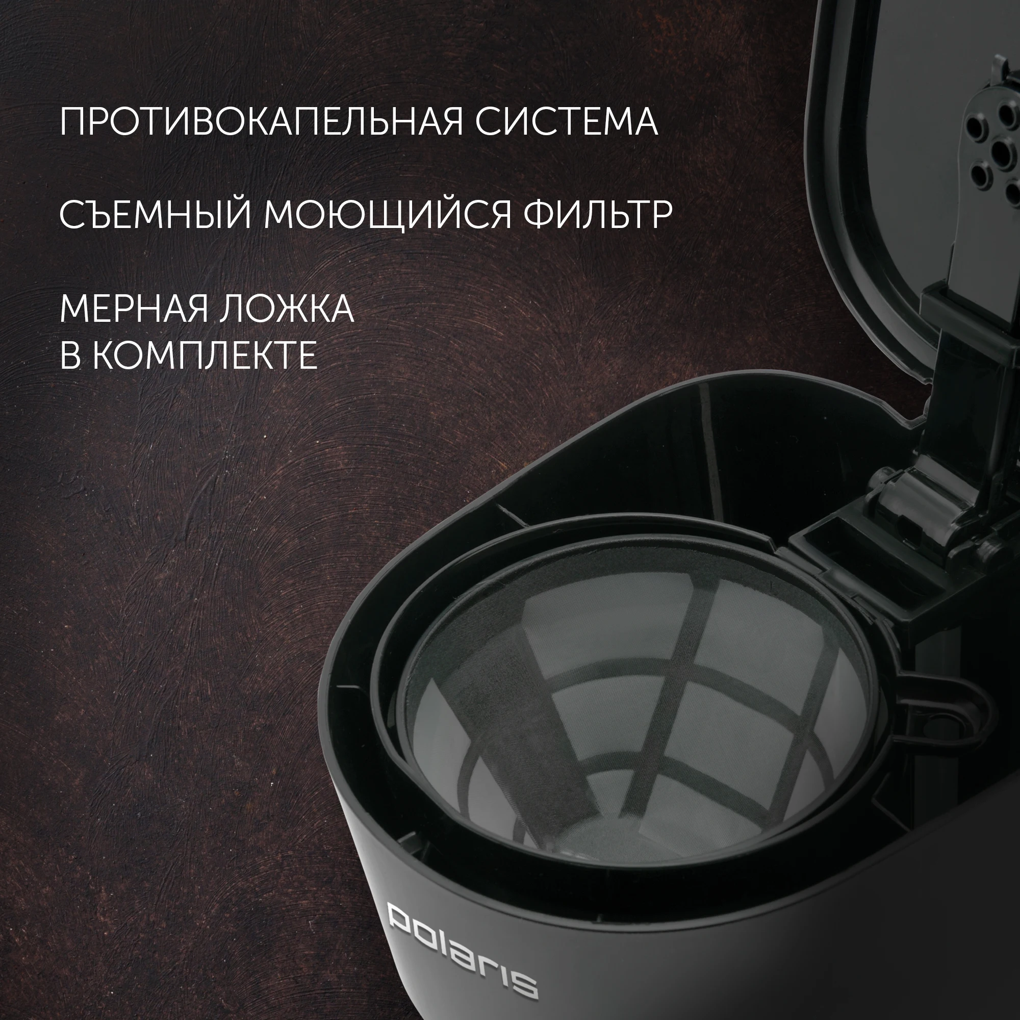 Противокапельная система. Защита от перегрева. Прозрачный резервуар для воды. Функция поддержания температуры. Стеклянная колба. Съемный моющийся фильтр. Шкала уровня воды. Мерная ложечка в комплекте. Напряжение: 220-240 В. Частота: 50 Гц.