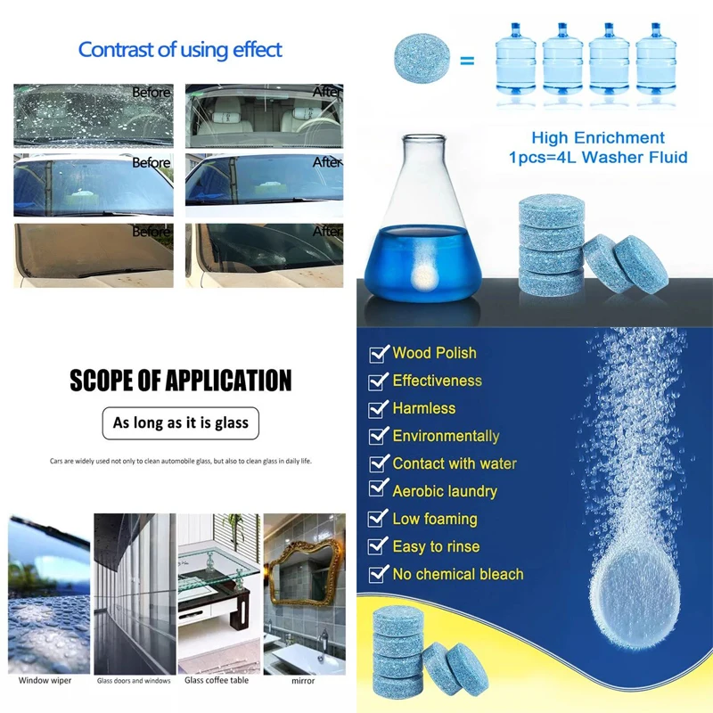 Высокое обогащение 1 шт. = 4 л жидкости для омывателя Удаление пятен Быстро растворимые Не повреждает стекло