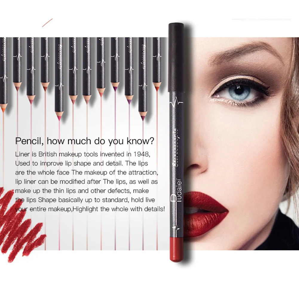Подводка для губ-это Британский инструмент для макияжа, изобретенный в 1948 году, используется для улучшения формы и деталей губ. Набор из 12 контуров для губ содержит 12 разнообразных цветов, которые удовлетворят ваши различные потребности в разных ситуациях. После нанесения карандаша для губ и помады губы становятся главным притягательным притягиванием лиц. Подводка для губ усиливает истончение губ и помогает устранить любые недостатки, чтобы придать губам форму, соответствующую желаемому виду. Водостойкий немаркий карандаш для губ 12 цветов делает его портативным и удобным в любое время. Мягкая и гладкая текстура понравится вашим губам.