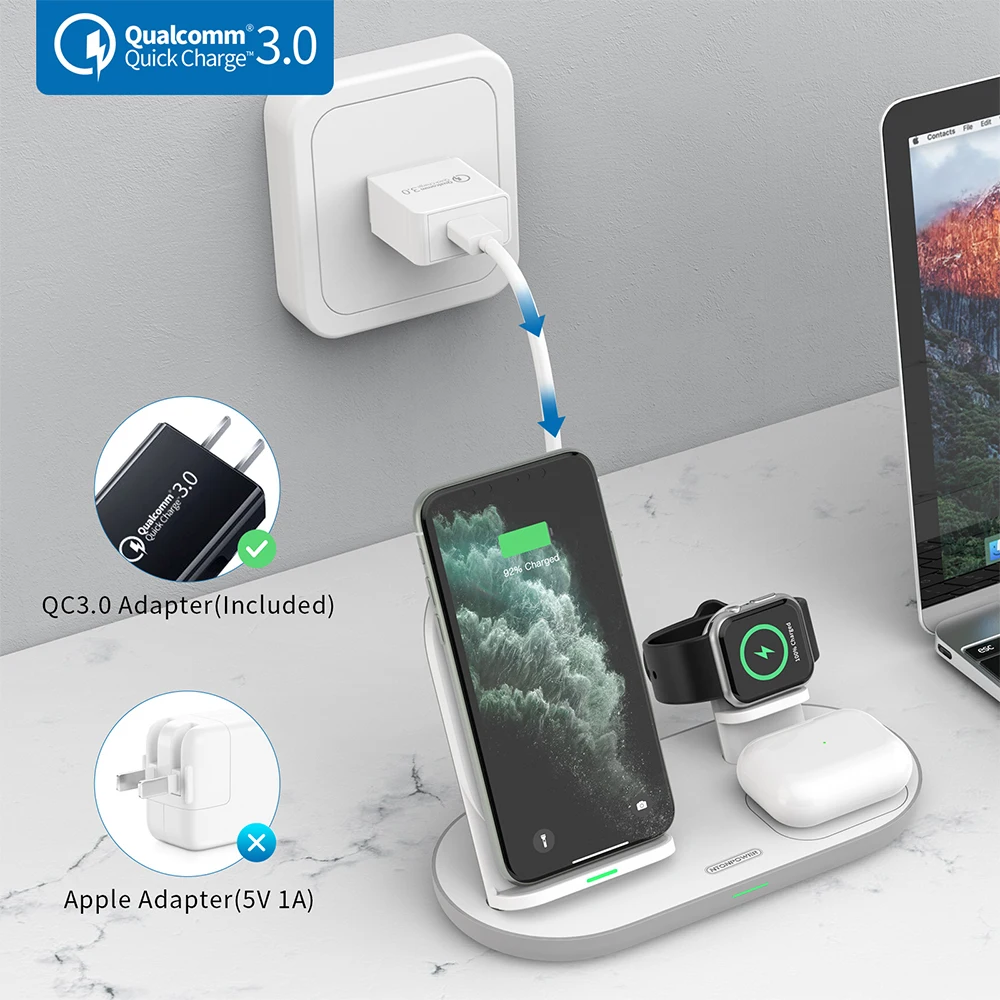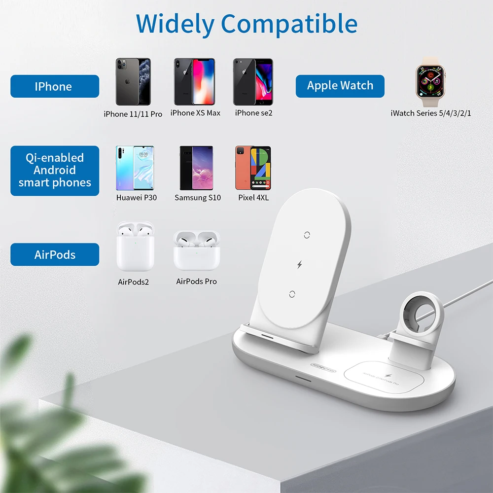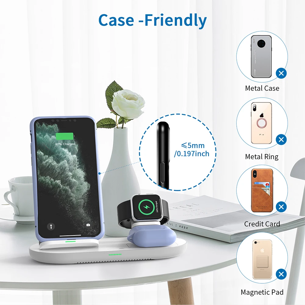 1. Портативный: съемное Беспроводное зарядное устройство три в одном, только один кабель типа C и один адаптер QC3.0 (в том числе) для зарядки всех ваших iPhone/Apple Watch/Airpods 2/Pro, чтобы сделать ваш рабочий стол и тумбочку более аккуратными. Эта беспроводная подставка для зарядного устройства может заряжать одновременно три устройства, что удобно для вашей жизни. 2. Удобство: с внутренней высококачественной индукционной беспроводной зарядной катушкой вы можете зарядить ваш iphone и Airpods Pro 2 с защитным чехлом 5 мм (максимум), что означает, что вам не нужно снимать чехол для телефона и чехол для наушников во время зарядки. Но обратите внимание, что вам нужно снять его, если с магнитным или металлическим корпусом. 3. Горизонтальная или вертикальная Зарядка: с внутренней двойной зарядной индукционной катушкой обеспечивает гибкую регулировку угла, которая может заряжать его во время просмотра видео по горизонтали, И зарядите его во время вызова видео с семьей и друзьями. 4. Быстрая зарядка: адаптер QC3.0 и один кабель типа C, 9 В/2 а позволяет вашему устройству заряжаться быстрее. Место для зарядки наушников также может заряжать мобильный телефон, но обратите внимание, что мощность места для зарядки наушников составляет 5 Вт, а мощность места для зарядки мобильного телефона-10 Вт/7,5 Вт. 5. Apple Watch: Вы должны положить оригинальное зарядное устройство Apple watch в полку, кроме того, он использует новейший скрытый дизайн кабеля, чтобы спрятать зарядное устройство apple watch (Примечание: зарядное устройство для часов не входит в комплект), что делает его компактным и аккуратным. 6. Конструкция магнита автоматической адсорбции: задняя крышка зарядной станции использует новейший дизайн магнита автоматической адсорбции, это удобно для установки, вам не нужно беспокоиться об этой проблеме, который не может плотно прилегать после длительного использования. Решить нестабильную зарядку большинства беспроводных зарядных часов на рынке, Используйте оригинальный кабель для передачи данных для более стабильной и долговечной зарядки.