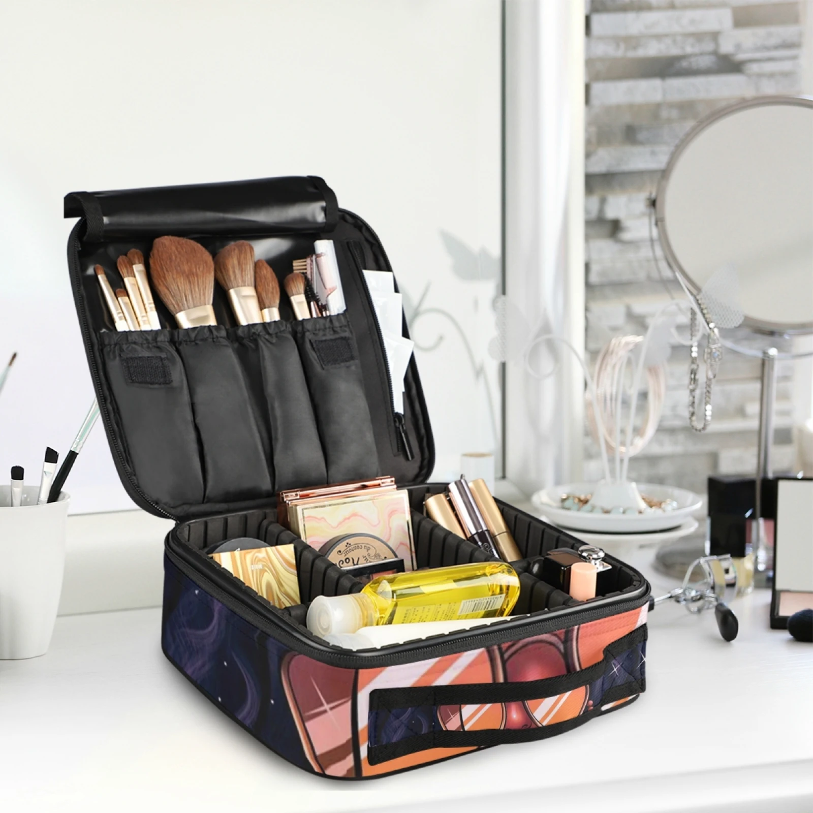 Уважаемый клиент, добро пожаловать в наш магазин. Мы гарантируем вам лучшую цену и лучшее обслуживание. Надеемся, вы получите удовольствие от покупок в нашем магазине. Если у вас есть какие-либо вопросы, пожалуйста, свяжитесь с нами. Информация о продукте :) Косметичка/сумка для хранения [Описание материала] саржевый Оксфорд [Описание размера] :25*22,5*9,1 см (9,8*8,9*3,6 дюйма) [Описание товара]: сумка представляет собой большое пространство с жесткой перегородкой посередине, благодаря чему можно свободно регулировать размер разделительного слоя, чтобы вместить разные косметики. Очень хорошо сортировать косметику, легко определить нужные вам предметы. На крышке сумки есть четыре кармана, для которых можно хранить кисти для косметики и другие предметы, а сбоку имеется карман на молнии.