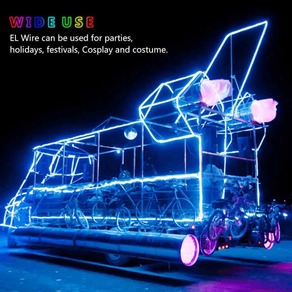 ·The luminous wire is flexible, and can be easily bent. It is perfect for parties, outfits, car decoration and so on. The EL wire light is rain resistant, but the battery pack is not waterproof. ·EL wire is easy to use, great bright, no radiation, energy saving and low voltage power.5.【Eco-friendly & Safety】 EL wire is easy to use, great bright, no radiation, energy saving and low voltage power. No environment pollution, no UV, no heat radiation, light down and no hurt eyes. Safety for children use. Long life time.