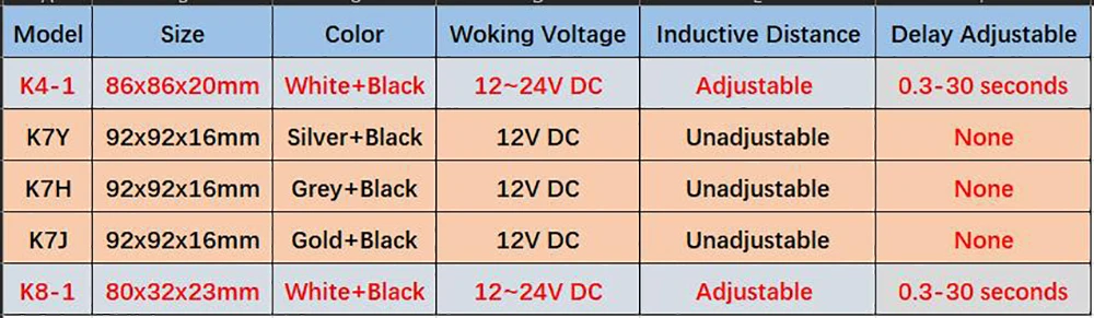 0,3-30 секунд задержки регулируется Установка поверхности Материал: пластик Контактная Оценка: 3A, AC 120V / DC 30V Входное напряжение: 12-24 В постоянного тока Выходной контакт: NO/NC/COM Рабочая температура (прибл.): от 0 до 50 ℃ Диапазон отклика: в пределах 10 см Светодиодный индикатор: Режим ожидания: Красный светодиодный, приближение посетителей: зеленый светодиодный индикатор Размер K4: 86x86x20 мм