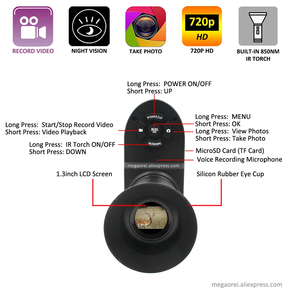 Это компактное, легкое, интегрированное крепление ночного видения с зажимом на задней части позволяет быстро и легко преобразовать ваш обычный прицел в современный режим ночного видения. Интегрированный 1,3 дюймовый экран на Megaorei3 окуляр покажет вам HD красочным изображением на дневного видения и черно-белую HD изображения в полной темноте на ночное видение. Вы видите все кристально чистое до 300 ярдов. Больше не нужно DIY, он идеально подходит для начинающих.