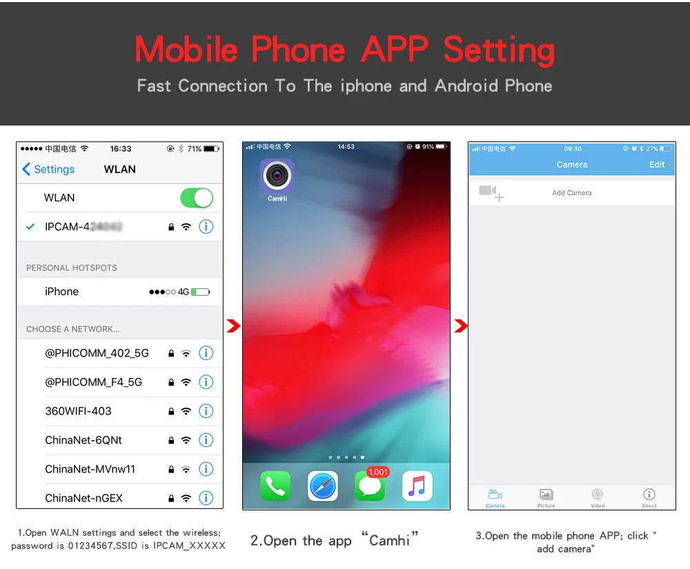 Формат SSID-это шесть Кол-во IPCAM - UID, пароль-01234567.