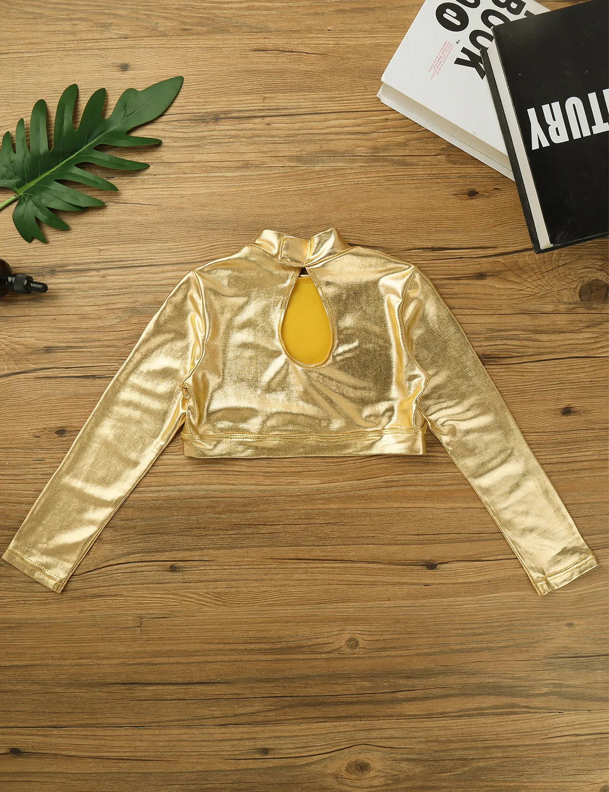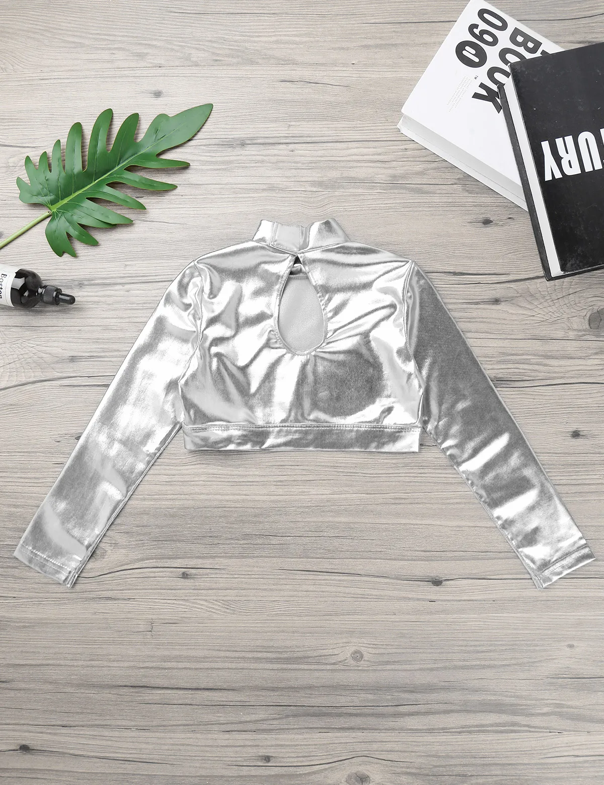 Топ с длинными рукавами оснащен ложным воротником, застежкой на липучке и застежкой-молнией сзади. Глянцевый внешний вид.