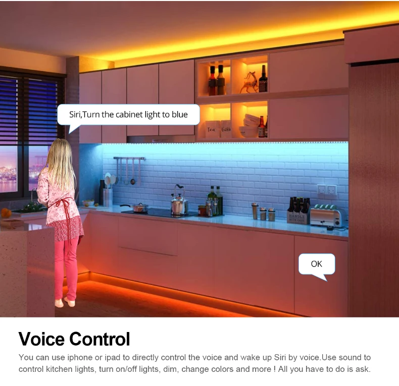 【Голосовое управление 】 Управляйте своей умной светодиодной лентой через свой голос с помощью Google Assistant/Alexa/Siri. Просто дайте голосовую команду, чтобы включить/выключить или затемнить/осветить ваш светильник, даже переключите светильник на определенный цвет, как вам нужно. Концентратор не требуется. Он работает с Apple HomeKit, поэтому вы можете легко управлять подключенной светодиодной лентой с помощью Siri на вашем iPhone, iPad, iPod touch или Apple Watch.