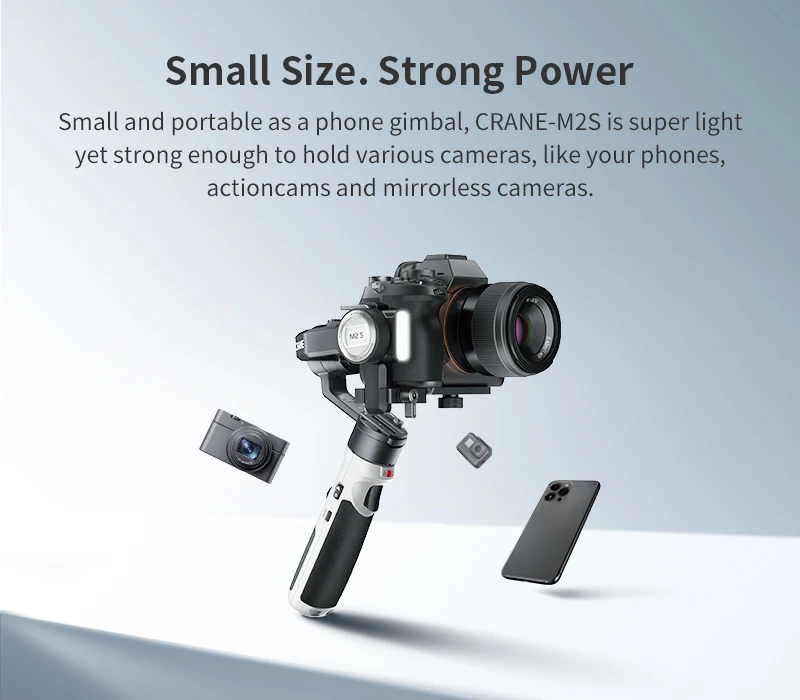 Small and portable as a phone gimbal, CRANE-M2S is super light yet strong enough to hold various cameras, like your phones, actioncams and mirrorless cameras. The 549g super lightweight body, combined with stronger motors and extended axes, makes it a must-have for run-and-gun filmmakers.