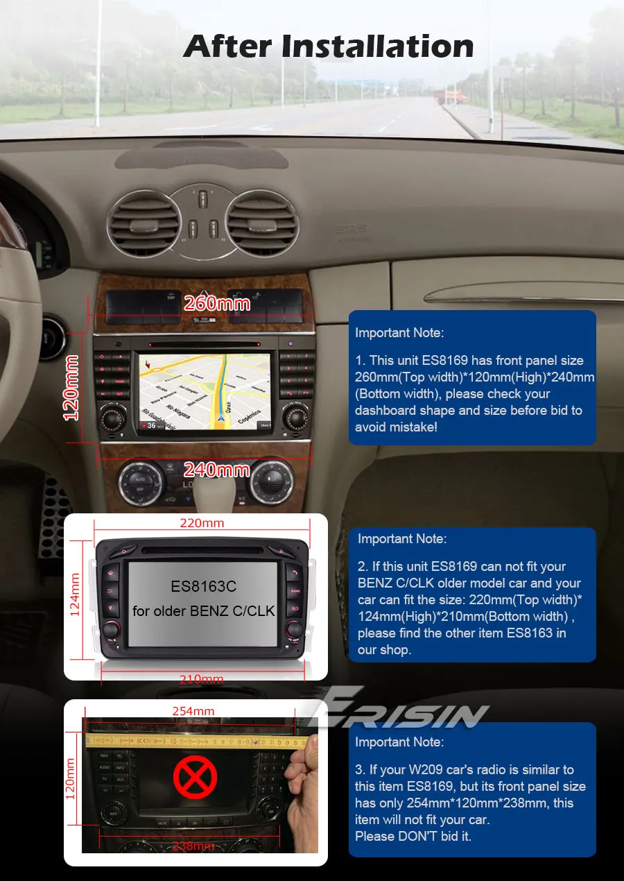 3. Если Размер передней панели этого устройства не подходит для вашегоBENZ C/CLK старая модельАвтомобиль, пожалуйста, найдите другой товарES8163CВ нашем магазине.