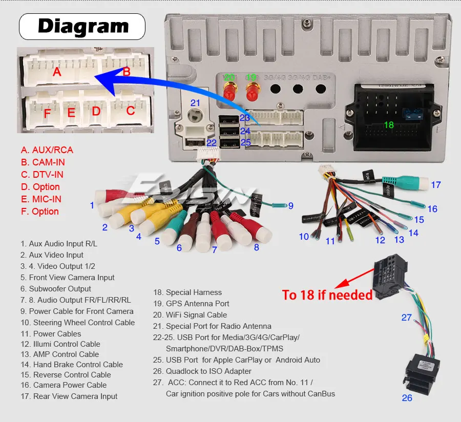 -Функция: может быть подключен к U-Disc, 3G/4G донгл, CarPlay ключ, TPMS-устройство, DVR-камера, DAB + коробка, смартфон и т. Д.