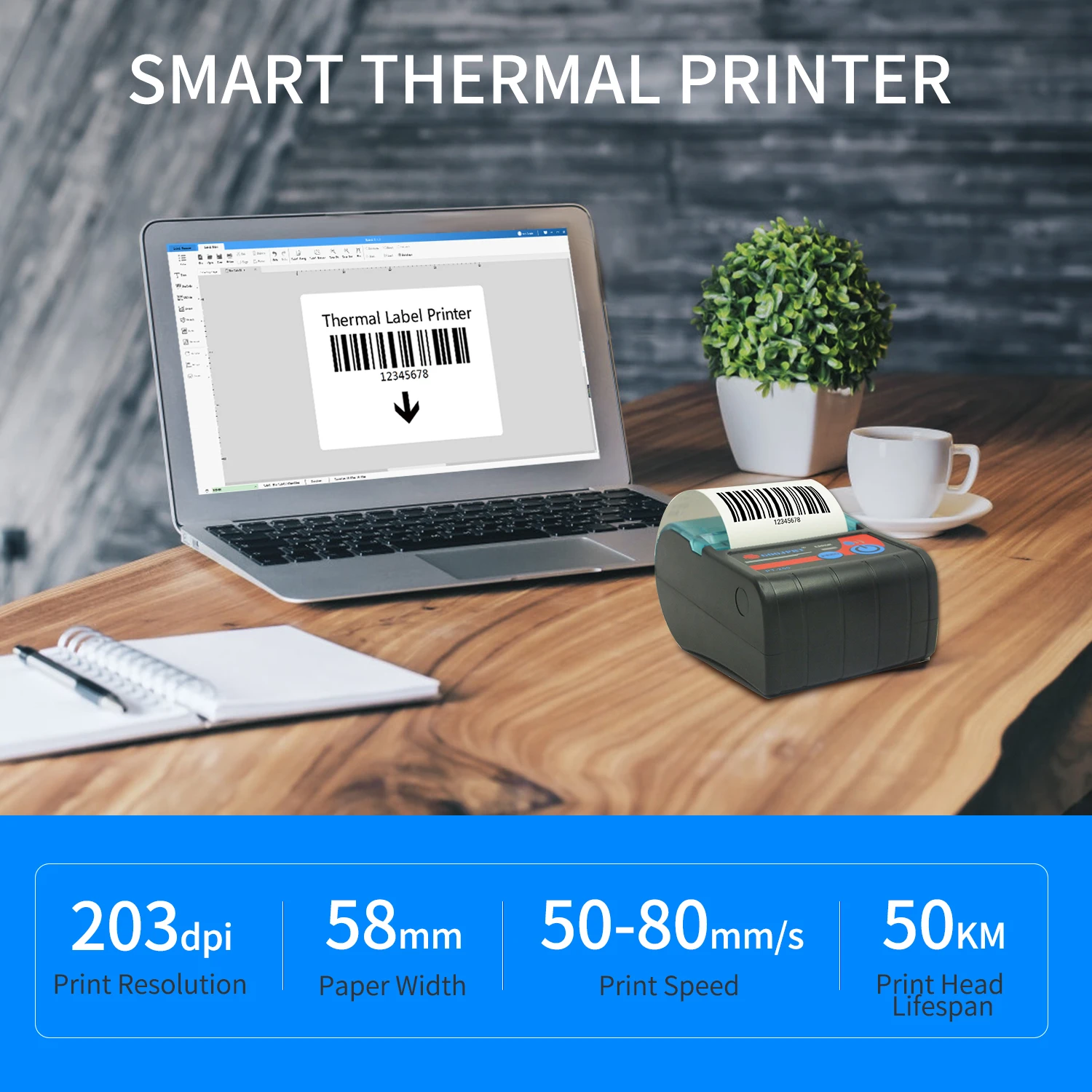 Портативный чековый принтер, разрешение 203 точек/дюйм, поддержка 58 мм размера бумаги, скорость печати до 80 мм/сек., высокая эффективность и четкая печать.