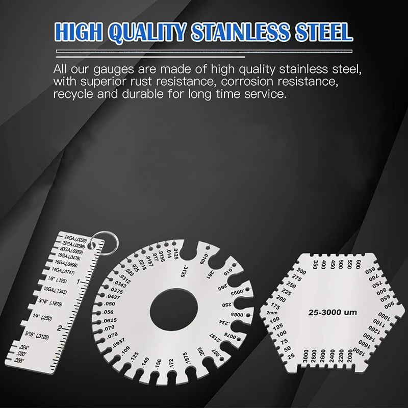 [Диапазон измерения]: гребень для влажной пленки составляет 25-3000 мкм. Двухсторонний круглый калибр для проводов имеет американский стандарт 0-36; Калибр для сварки толщины листового металла составляет 24GA (.0239), 22GA (.0299), 20GA (.0359), 18GA (.0478), 16GA (.0598), 14GA (.0747), 1/8 дюймов (.0125), 10GA(.1345), 3/16 дюймов (.1875), 1/4 дюйма (.250), 5/16 дюймов (.3125), (.024 дюйма), (.030 дюймов), (.035 дюймов).