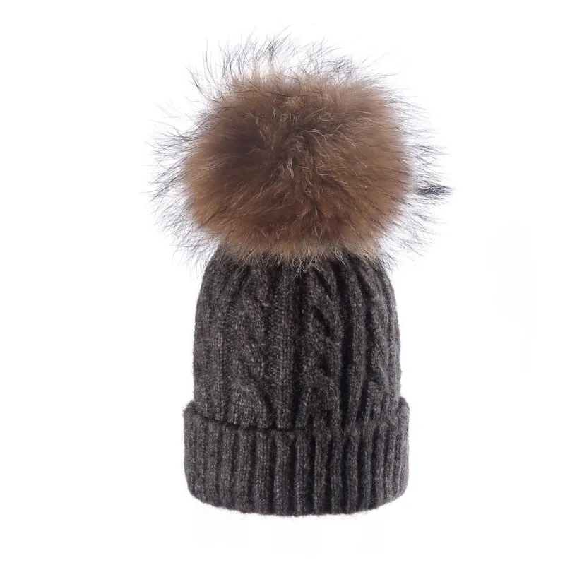 Большая Меховая шапка с вязаным помпоном, шапки осень-зима, милые теплые трикотажные шапки для девочек и мальчиков, Детская однотонная шапочка из натурального енота