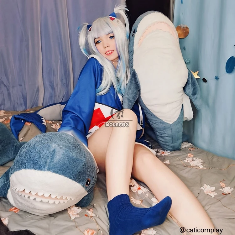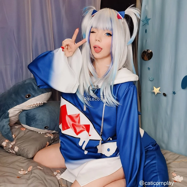 ROLECOS Hololive Gawr Gura Cosplay Wig Gawr Gura Long Hair Cosplay Anime Hololive White Mixed Bule 60CM Women Halloween Headwear