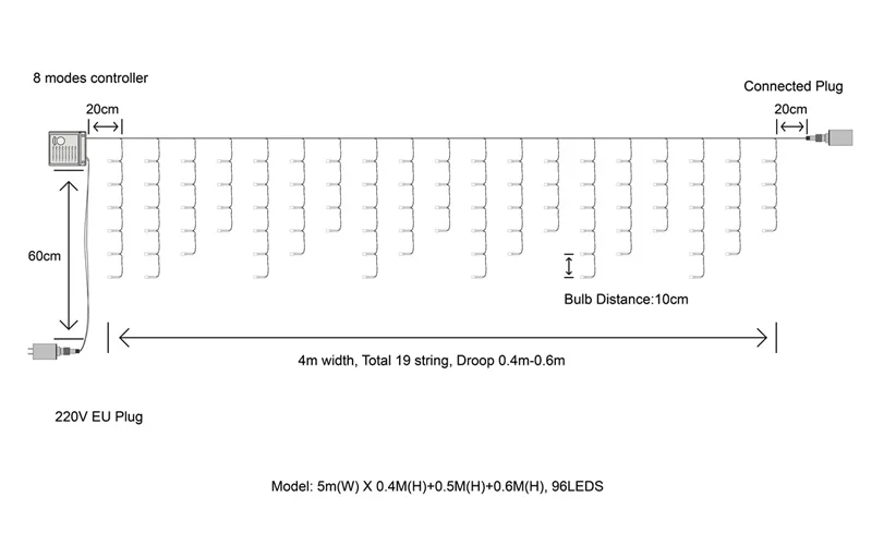 КомбинацияВ волнеПоследовательногоМедленное мерцаниеПоочередное мерцание/миганиеМедленное затуханиеМерцание/миганиеУстойчивыйЦвет СВЕТОДИОДА: теплый белый/многоцветныйНапряжение: штепсельная вилка европейского стандарта 220 ВКоличество капель: 19 линийКоличество светодиодов: 96 шт.Размер: 5 м (Ш) х 0,4 м (в) + 0,5 м (в) + 0,6 м (в)Материал: ПП и ТПР и CR-V стальТвердость: H.R.C. В переменного тока, 50-52Разъем: всего 5 метров в длинуСредняя линия (линия): 4 метраРазъем к контроллеру: 0,6 метровОт контроллера к свету: 0,2 метровХвостовая вилка к свету: 0,2 мЦвет кабеля: прозрачный белыйПакет включает в себя:Световая Гирлянда для занавесок из 1 предметаПримечания: этот занавес струнный свет с удлинителем, вы можете подключить другойПоследние несколько лет часто пользуюсь услугами этой компании, частенько делаю заказы, для дома, для детей и для себя любимой, и... Читать отзыв полностью...