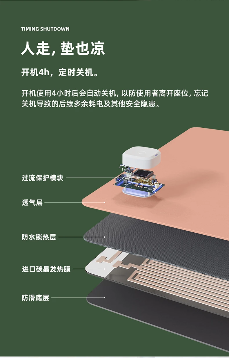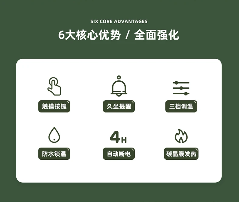 1.96% обогрев большой площади Быстрая лихорадка 2,15 с 3. Трехскоростной контроль температуры 4. Умное напоминание о сидячем положении 5. Безопасное Автоматическое отключение питания