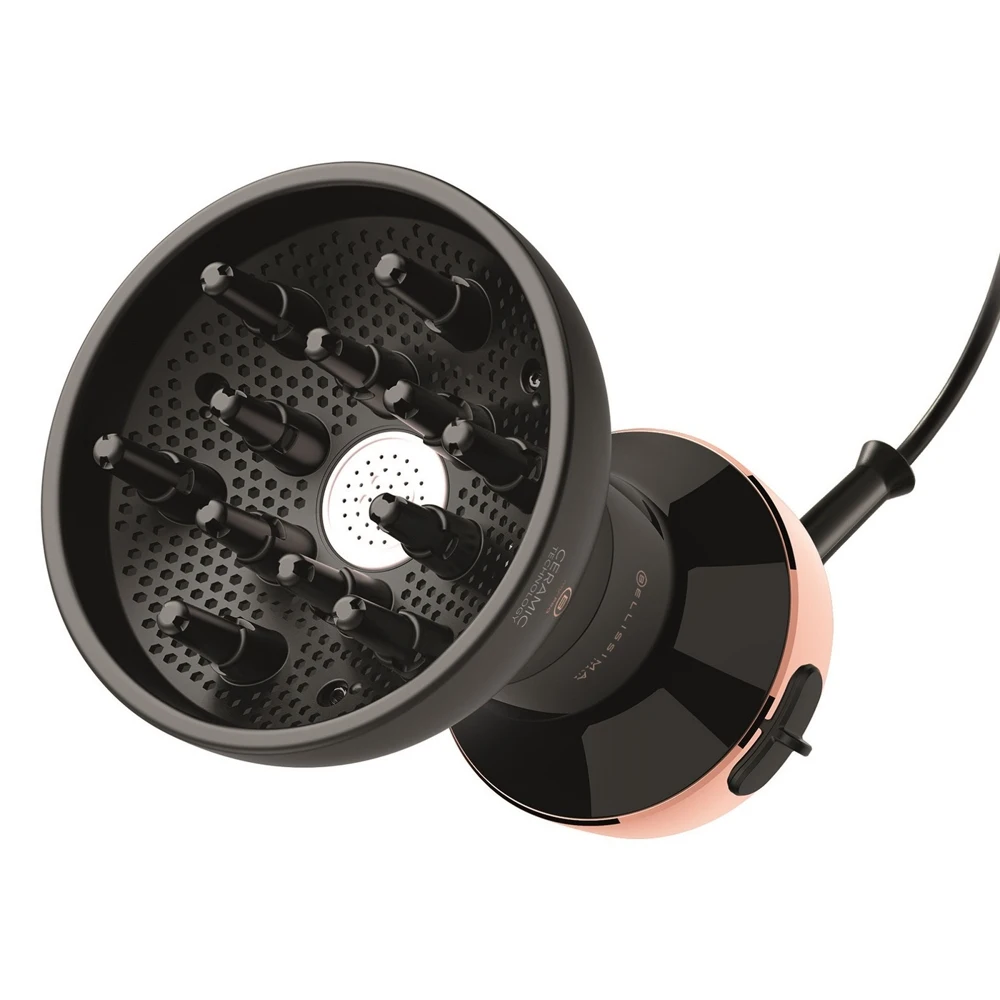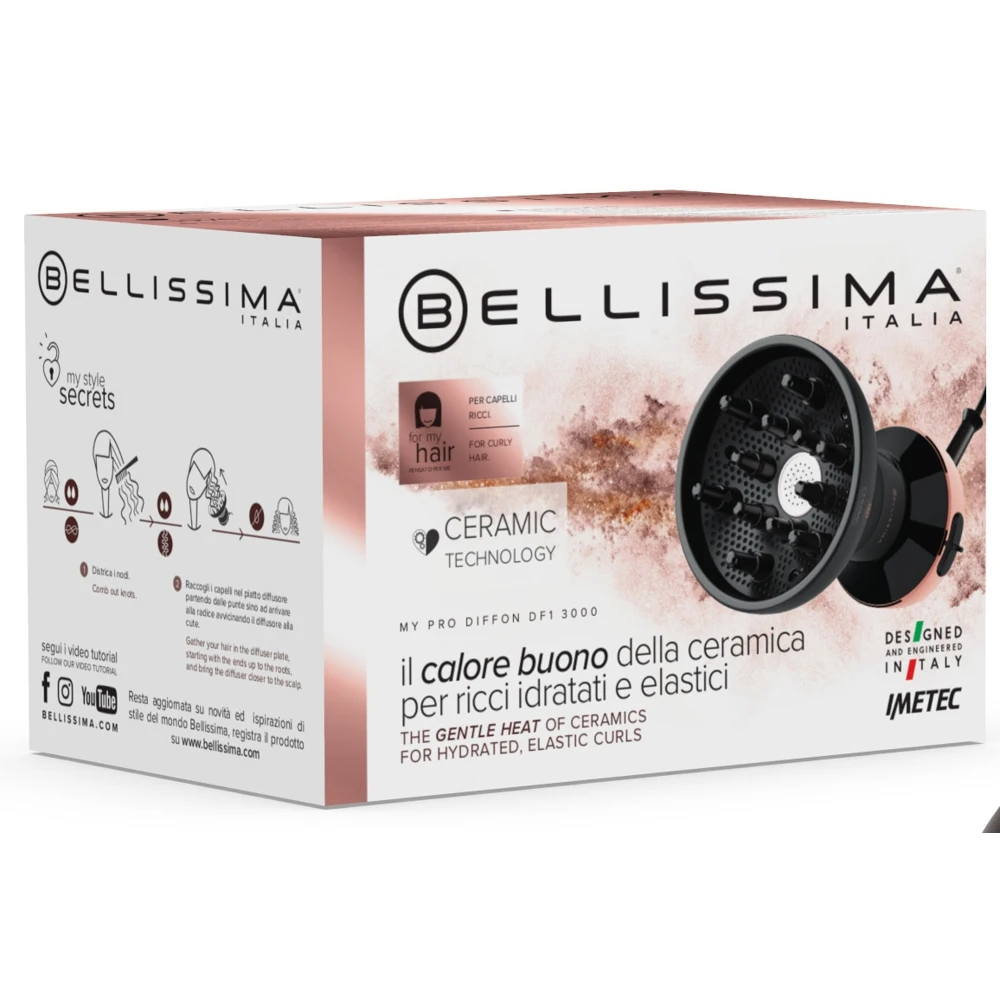 Bellissima My Pro Diffon - это диффузор горячего воздуха, сочетающий диффузор 130 мм и фен в одном приборе, чтобы сделать вьющиеся волосы ещё красивее. Во время сушки технология керамики увлажняет и делает волосы красивее: керамика, нагреваясь, производит безопасное тепло, которое защищает волосы, предотвращая их завивание и сухость;