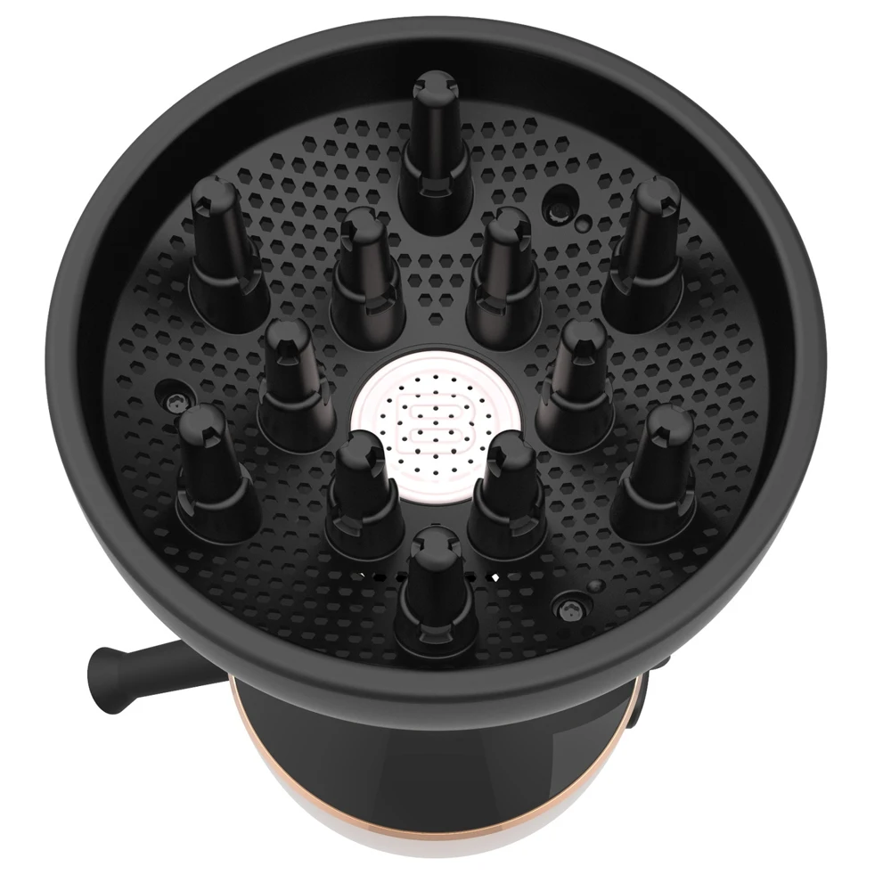 Синергетическое действие специальной перфорированной решётки, которая равномерно распределяет воздух, и 12 длинных штырьков, формирующих завитки, позволяет высушить волосы максимально деликатно: локоны не распадаются и сохраняют свою естественную эластичность!