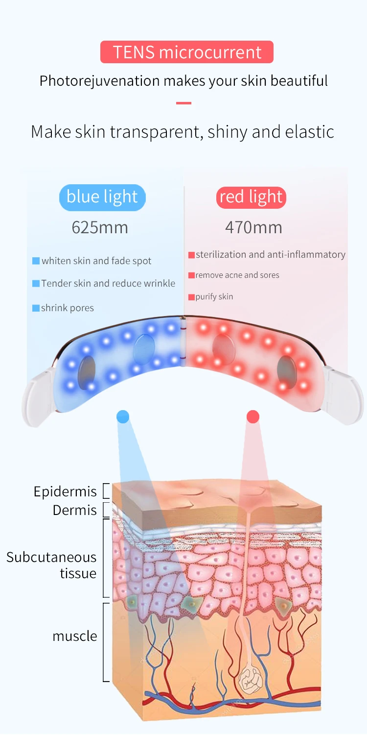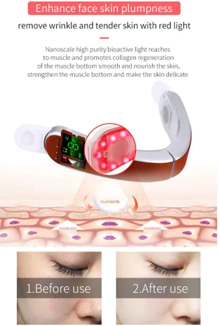 1. Инфракрасная терапия горячим компрессом расширяет поры через горячий компресс, выводит токсины для содействия поглощению кожи питания, стимулирует секрецию коллагена, активирует коллагеновые волокна и уменьшает морщины лица. 2. Синий светильник для удаления акне, красный светильник для плоской кожи от морщин. 2 лампы работают вместе для комплексного ухода за кожей. 3. Сильный результат v-образной формы может эффективно зафиксировать контуры лица, сделать лицо меньше и гладче. 4. Десятки физиотерапии и микро-тока приняты для повышения активности клеток, способствует мышечному движению, ускоряет кровообращение, улучшает метаболизм жира, который может вытянуть лицо для более тонкой, гладкой и упругой линии лица.