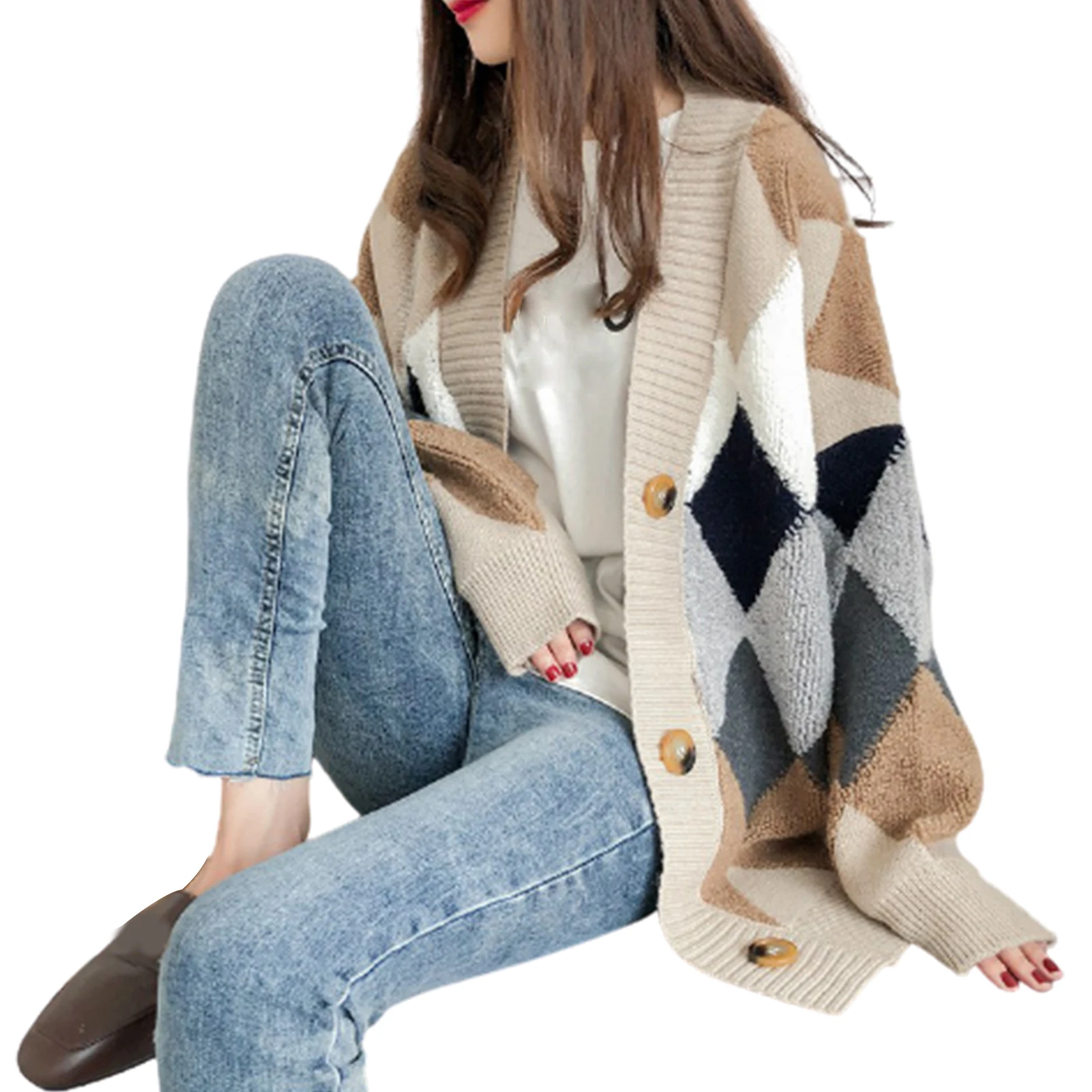 2020 новые модные женские Свитера Осень Зима повседневные клетчатые кардиганы с v-образным вырезом однобортный свободный свитер с пышными рукавами