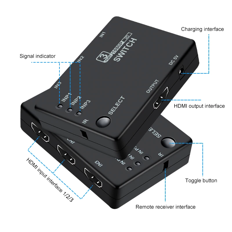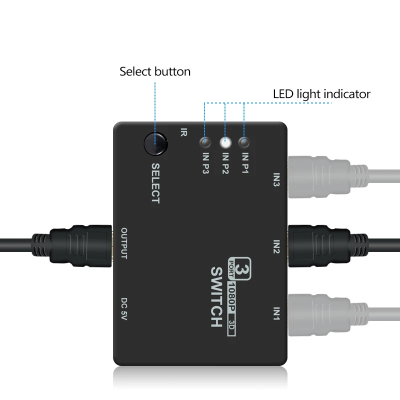 2. HDMI-совместимый коммутатор может поддерживать видео форматы, включая 720p,1080i,1080p. Этот продукт также может быть помещен в конце длинного кабеля HDMi для регенерации сигнала hdmi.