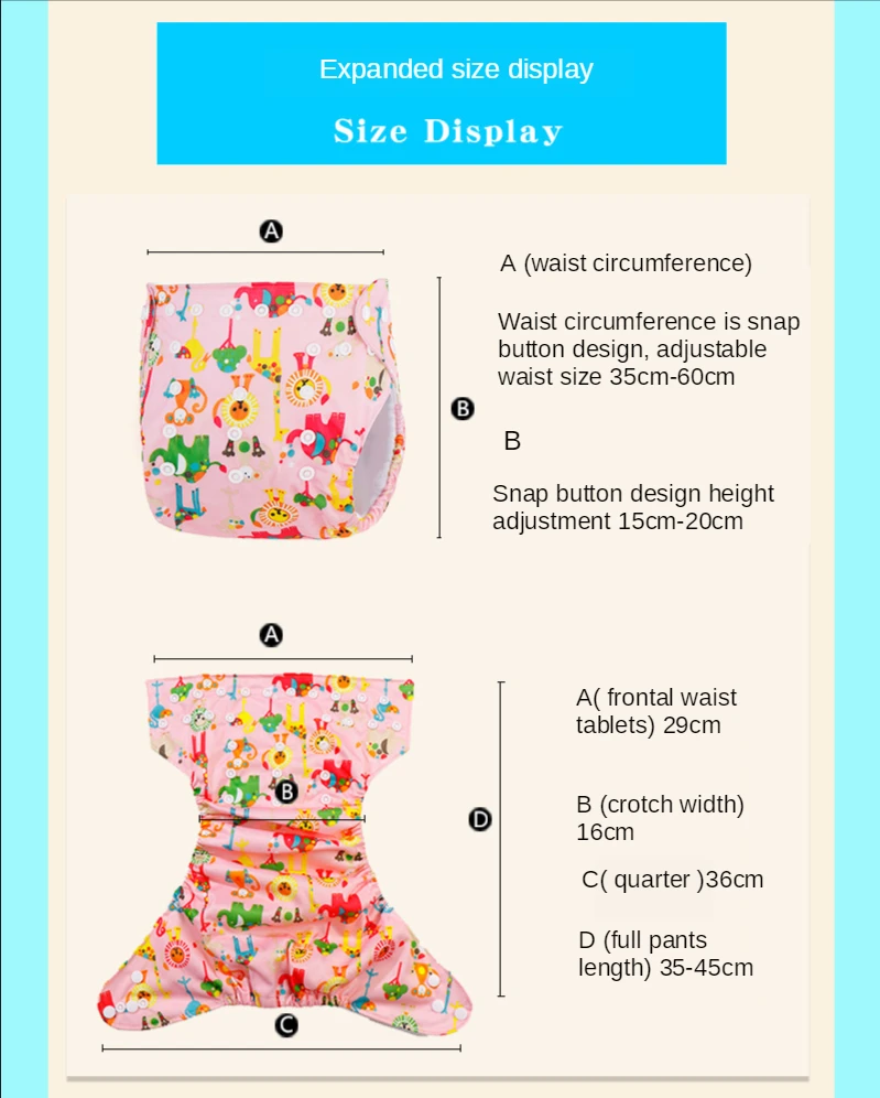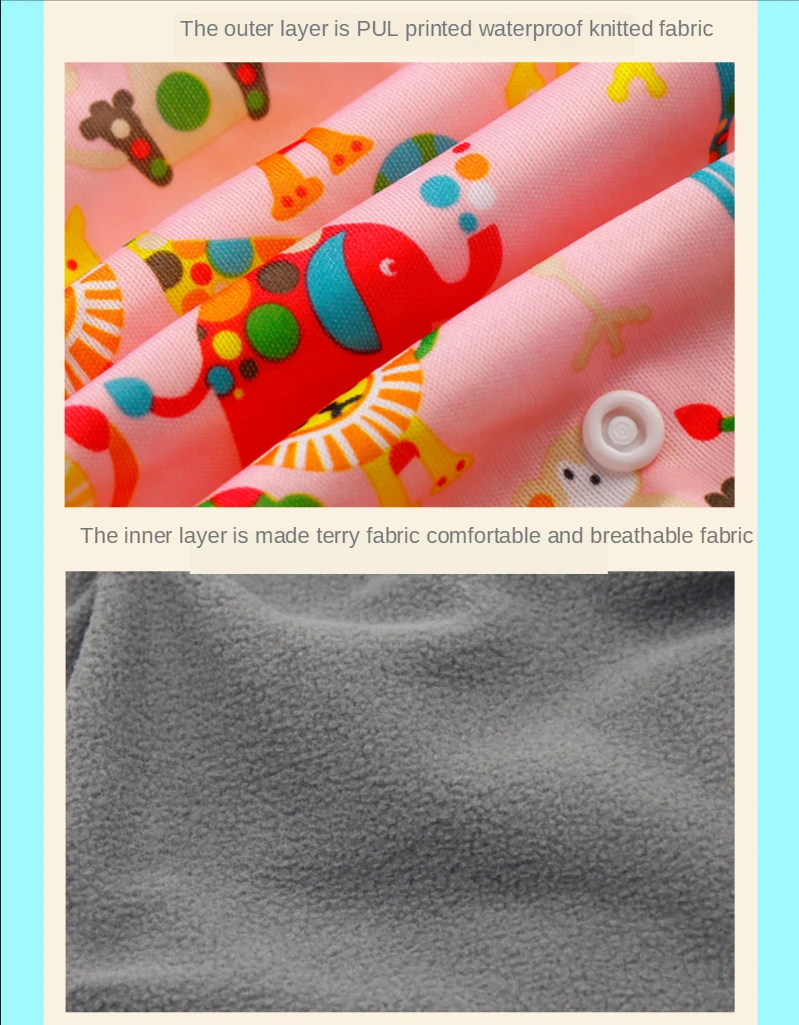 Ткань: 1. Продукт представляет собой трехслойную конструкцию, а внутренняя поверхность внешнего слоя (лицевая ткань) сочетается с высокой эластичностью, прочностью на растяжение и хорошей гибкостью. 2. Его можно стирать много раз без деформации и повреждений. Водонепроницаемая и дышащая мембрана может предотвратить протекание мочи ребенка. 3. Общий подгузник изготовлен из ПВХ (он будет сломан, когда он не имеет эластичности, не пропускает воздух), и экологический материал ТПУ дышащая пленка используется в качестве водонепроницаемого покрытия, что значительно улучшает гибкость и воздухопроницаемость. Подходит для использования в течение всего года, это важный продукт для новорожденных. Характеристика: 1. Удобные и дышащие, супер поглощающие 2. Тип брюк, легко надевать 3. Простота в использовании, охрана окружающей среды и санитария 4. Многоразовые и моющиеся