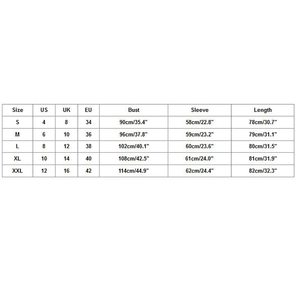Размер США Великобритания ЕС Бюст Рукав Длина S 4 8 34 90 см/35,4 дюйма 58 см/22,8 дюйма 78 см/30,7 дюйма М 6 10 36 96 см/37,8 дюйма 59 см/23,2 дюйма 79 см/31,1 дюйма L 8 12 38 102 см/40,1 дюйма 60 см/23,6 дюйма 80 см/31,5 дюйма XL 10 14 40 108 см/42,5 дюйма 61 см/24,0 дюйма 81 см/31,9 дюйма XXL 12 16 42 114 см/44,9 дюйма 62 см/24,4 дюйма 82 см/32,3 дюйма