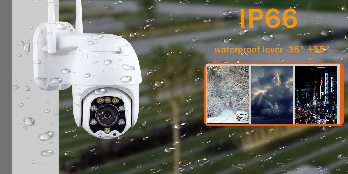 Ваша камера оснащена IP66 чехол, высококачественный ABS инженерный материал делает его при температуре-20 ° ~ 50 ° нормально работать на открытом воздухе, это означает, что он достаточно силен, чтобы работать при такой тяжелой погоде, как шторм и Снежная погода, и всегда ставит вашу безопасность в первую очередь.