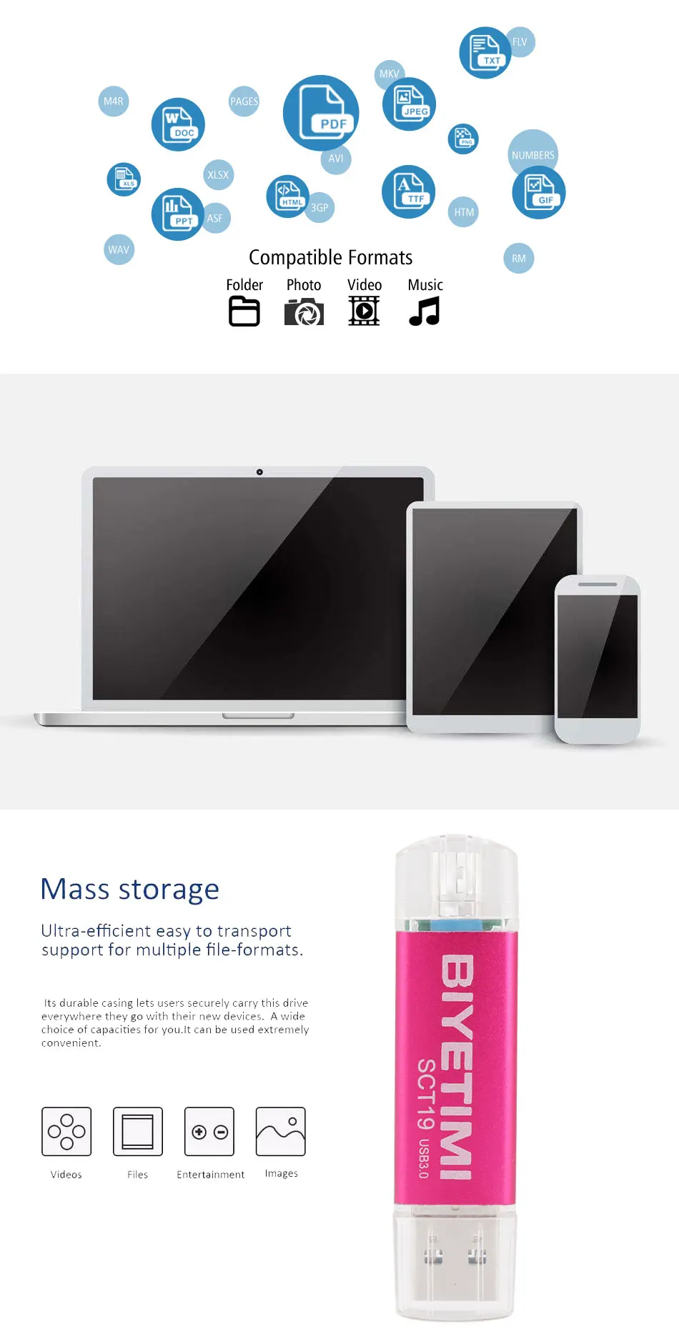 Описание продукции Особенности: ● Интерфейс USB 3,0 для более высокой скорости и большей стабильности ● Конструкция «2 в 1 с Тип-c и USB 3,0 разъемы ● Простая передача данных между компьютерами, планшетами и смартфонами ● Совместимость с большинством смартфонов и планшетов Android OTG ● Портативный, легкий, Премиум Металлический Поворотный колпачок для защиты разъемов ● Предварительно загруженное программное обеспечение для просмотра документов для всех основных форматов файлов Просто подключи и играй, готов к управлению файлами Этот разъем OTG Type-c применяется только к аппаратным средствам Android Посылка включает в себя: 1 USB флеш-накопитель, Емкость: Из-за различных методов расчета, плохих блоков или встроенного программного обеспечения емкость памяти USB флэш-накопителя может быть меньше видна на ПК. И чем больше емкость, тем больше отклонение. Метод расчета в индустрии хранения: 1 ГБ = 1000 МБ = 1000 * 1000кб = 1000*1000 * 1000B Метод расчета операционной системы: 1 ГБ = 1024 МБ = 1024 * 1024кб = 1024*1024 * 1024B Таким образом, 1 Гб памяти в операционной системе отображается как: (1000 ^ 3) / (1024 ^ 3) ≥ 0,93 ГБ. 4 ГБ = Approximately3 6 ГБ-3,8 ГБ 8 ГБ = от Approximately7 4 ГБ-7,6 ГБ 16 Гб = приблизительно 14-15 ГБ 32 Гб = приблизительно 28 ГБ 30 Гб 64 ГБ = приблизительно 58-62 ГБ 128 ГБ = Приблизительно 110-120 ГБ 256 ГБ = Приблизительно 220-238 ГБ Это расчетная разница между производителем и вашим ПК. Google "возможность USB флэш-накопитель" для получения дополнительной информации. Классы: 1. Чтобы избежать потери данных или механических повреждений, не выключайте питание компьютера во время передачи. 2. Во время использования не удаляйте флеш-накопитель USB, в противном случае данные могут быть потеряны. 3. После использования флеш-накопителя USB лучше безопасно извлекать флэш-накопитель с компьютера, что поможет продлить срок его хранения. 4. Используйте FAT32 или exFAT для форматирования диска. Пожалуйста, не форматируйте флеш-накопитель USB часто, в противном случае USB легко поврежден. 5. Ваши устройства (такие как телевизоры, автомобильные плееры, радиоприемники и другие устройства, которые должны распознавать u-диски) должны иметь последний usb-драйвер для распознавания u-дисков. Многие старшие школы могут распознать только U диски ниже 32G. 6. Перед размещением заказа проверьте, поддерживает ли ваш смартфон/планшет функцию OTG. Предложение по использованию: пожалуйста, нажмите «безопасный выход» в системе перед отключением U диска после завершения использования каждый раз.