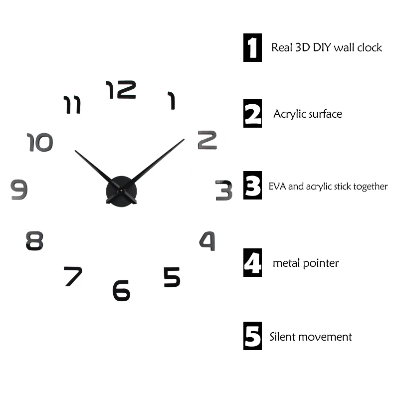 EVA и акрил уже склеиваются, не нужно, чтобы клиент сделал это снова 1. Наклейки сделаны из материала EVA пены и зеркального материала, который не токсичен и не выцветает, может прослужить около От 3 до 5 лет. 2. Наклейки могут быть съемными, с клеем на обратной стороне, легко наклеить на стену или любую другую чистую и гладкую поверхность; Например, дверь, шкаф и так далее; 3. Зеркало с клеем, прежде чем наклеить наклейку на стену, необходимо сначала наклеить зеркало на поверхность наклейки; 4. Diy дизайн, размер макета часов измеряется руками, может быть меньше или больше размера. Материал наклейки: ЭВА пена (этиленвинилацетат) Материал часов: металл Часовая стрелка: 31,5 см/23,5 см Минутная стрелка: 39 см/31,5 см Часовой механизм: 12 см/10 см Минимальное достижения: 63 см x 63 см/50 см x 50 см Окончательный размер украшения часов определяется тем, как вы хотите украсить ваши стены.